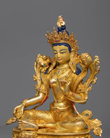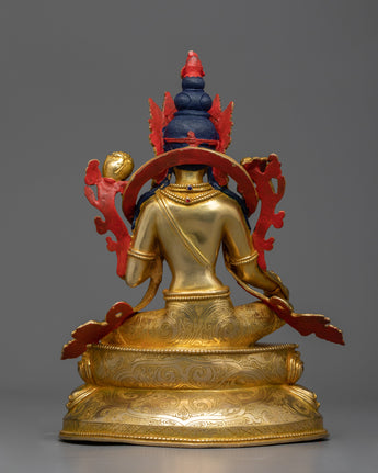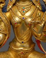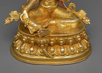 Presenting the Arya Tara Idol "Green Tara," one of the pantheons of Buddhist deities, is a celestial representation of proactive kindness and prompt aid. With a weight of 2.15 kg and an elegant height of 9.8 inches on a 6.6-inch base, this statue perfectly embodies Green Tara's vibrant energy and charitable spirit. With its intricate gold and acrylic paintings, intricate 24K gold plating, and copper body construction, this item embodies the spiritual purity and protective might of Arya Tara.