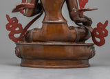With this Ārya Tārā statue, you can travel into the center of compassion and emancipation. The beautiful patina of the oxidized copper body echoes the old tales of Tara's generosity and quick action. Every intricate detail reflects her tremendous devotion to reducing suffering and guiding sentient beings to enlightenment. This sculpture is more than just a work of art; it is a touchstone for individuals on the road to spiritual awakening, engulfing their surroundings in an aura of protecting compassion.