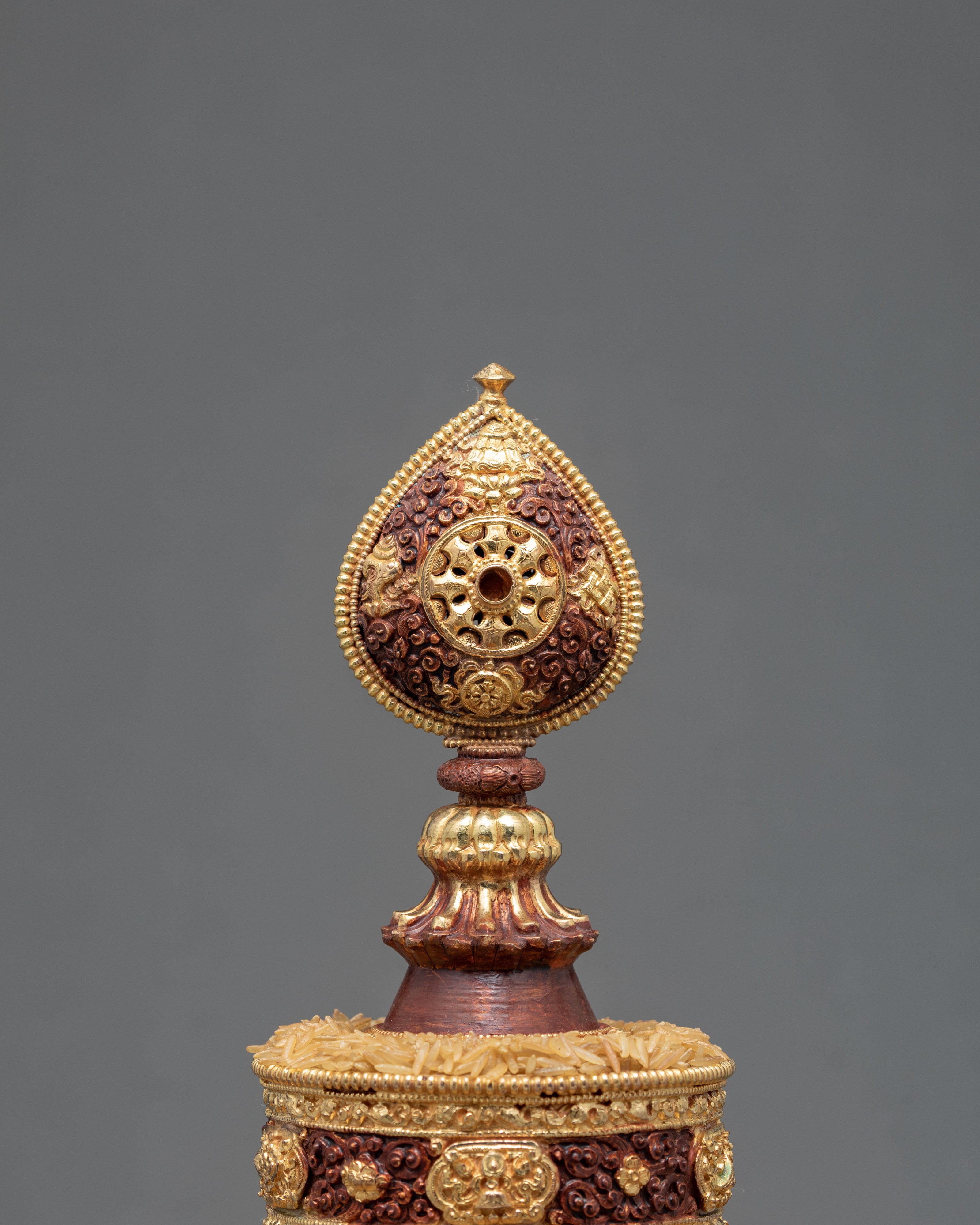 The higher the value of the offerings, the higher degree of merit one will achieve. Also, the higher the quality of one’s visualizations during the meditation will bring about greater merit. Once the mandala set is filled, one may raise the entire piece over his or her head, symbolizing their willingness to sacrifice the entirety of existence in order to aid others in attaining enlightenment. Through this sacrifice, one will gain both wisdom and merit. At the end of practice, one should visualize benevolent deities transforming into a white light and entering the soul of the practitioner.