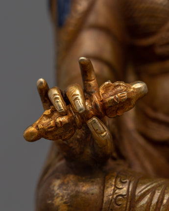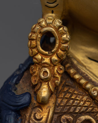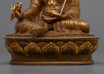 With our Guru Rinpoche Asia Culture Art, you can enjoy a fusion of artistic workmanship and spiritual inspiration. This 9.4"-tall, 1.36 kg statue is the work of our Nepalese artisans, and it stands on a sturdy 5.9" base. This work of art, which has a copper body with 24-karat gold gilding and delicate acrylic paints, is a genuine monument to the depth of Asian culture and art. Guru Rinpoche, a respected person in Tibetan Buddhism, is depicted ingeniously in the statue's outstanding design. It is a captivating addition to your spiritual space or home décor, thanks to its serene demeanor and intricate adornments.