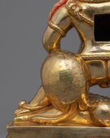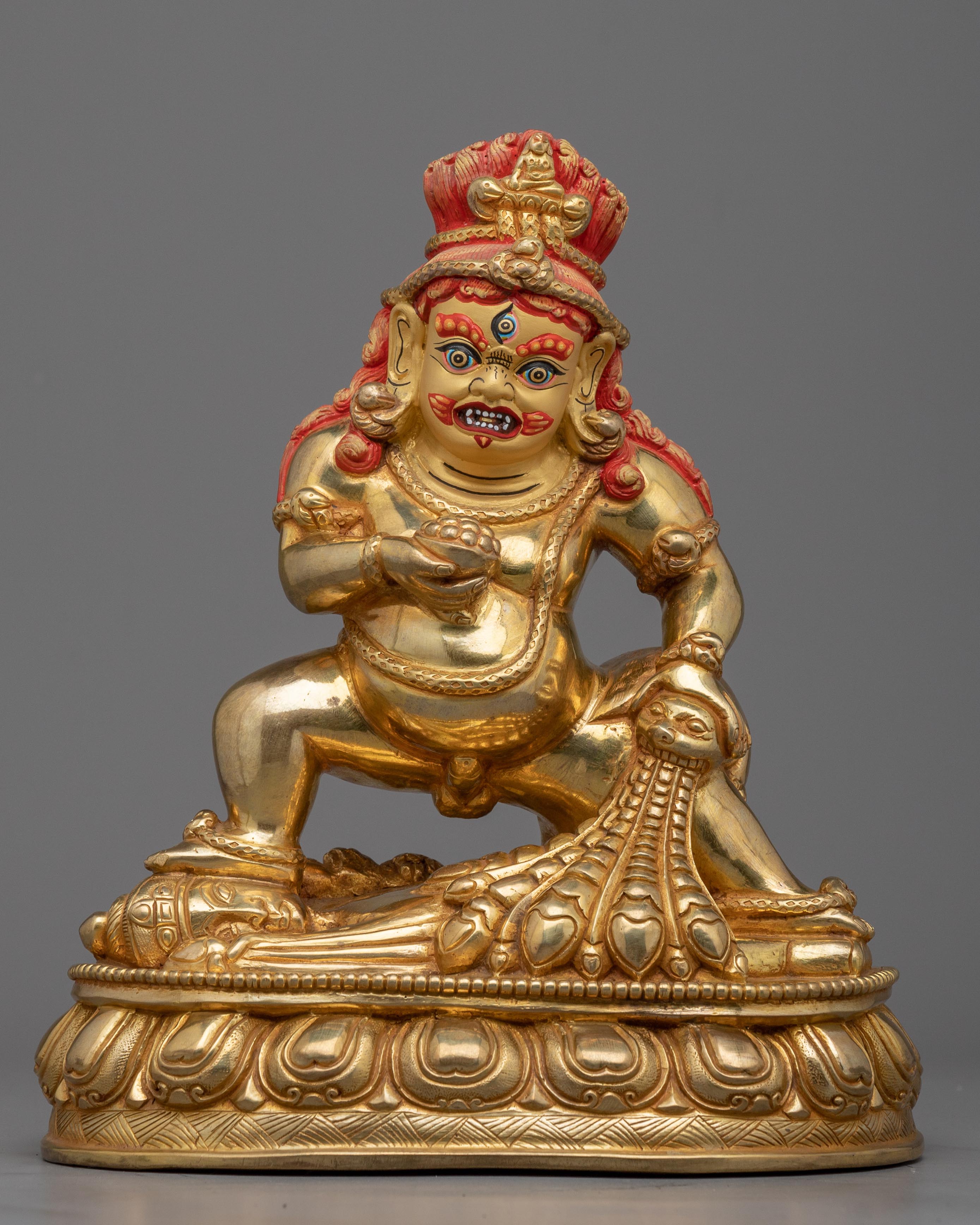 Our Black Dzambhala sculpture / Asian Arts and Crafts is a powerful depiction of the Tibetan Buddhist deity of riches. This 2.20-kilogram statue, which stands 8.6" tall with a base measuring 7.4", is evidence of the craftsmanship of Nepalese craftspeople. An actual work of art to be admired and treasured, it is made from a copper body and is embellished with 24-karat gold gilding and acrylic paintings. This incredible Black Dzambhala statue is more than just a decorative piece; it represents spiritual success and abundance. Thanks to the gold plating and intricate craftsmanship, it is a beautiful addition to your shrine, office, or living room. This statue symbolizes the rich Buddhist tradition and cultural legacy and is a superb example of Asian arts and crafts.