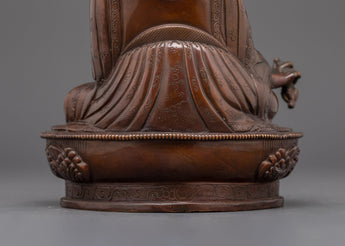 Guru Rinpoche is seen holding a vajra, or thunderbolt, in his right hand, which represents unbreakable wisdom and the capacity to sever ignorance. In a pose known as contemplative equipoise, his left hand is resting on his lap as he holds a skull cup filled with nectar, symbolizing the conversion of vices into knowledge. He wears a royal robe that has been painstakingly crafted with an oxidized copper finish, emphasizing the folds and textures that give the garment life and movement.