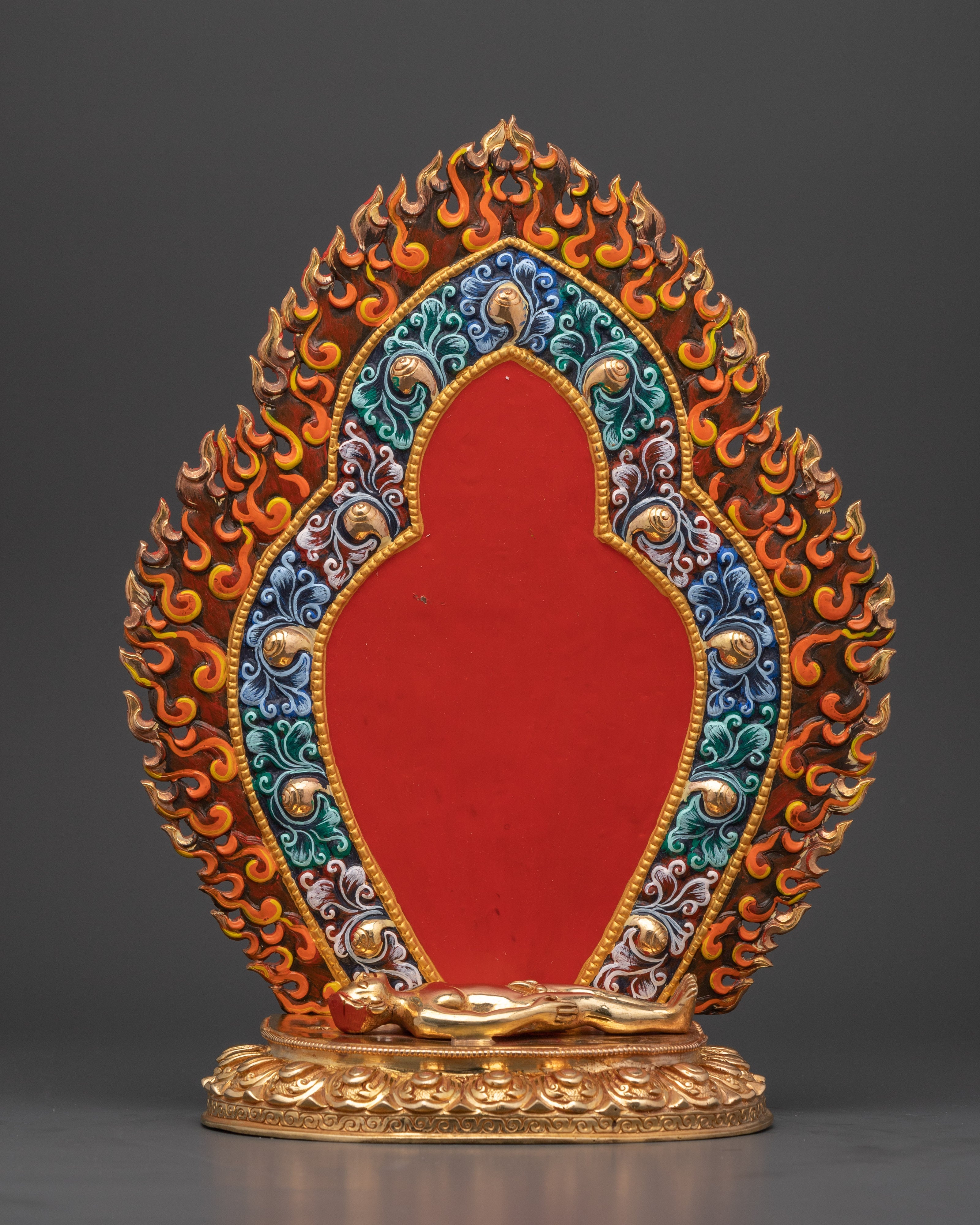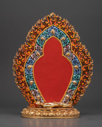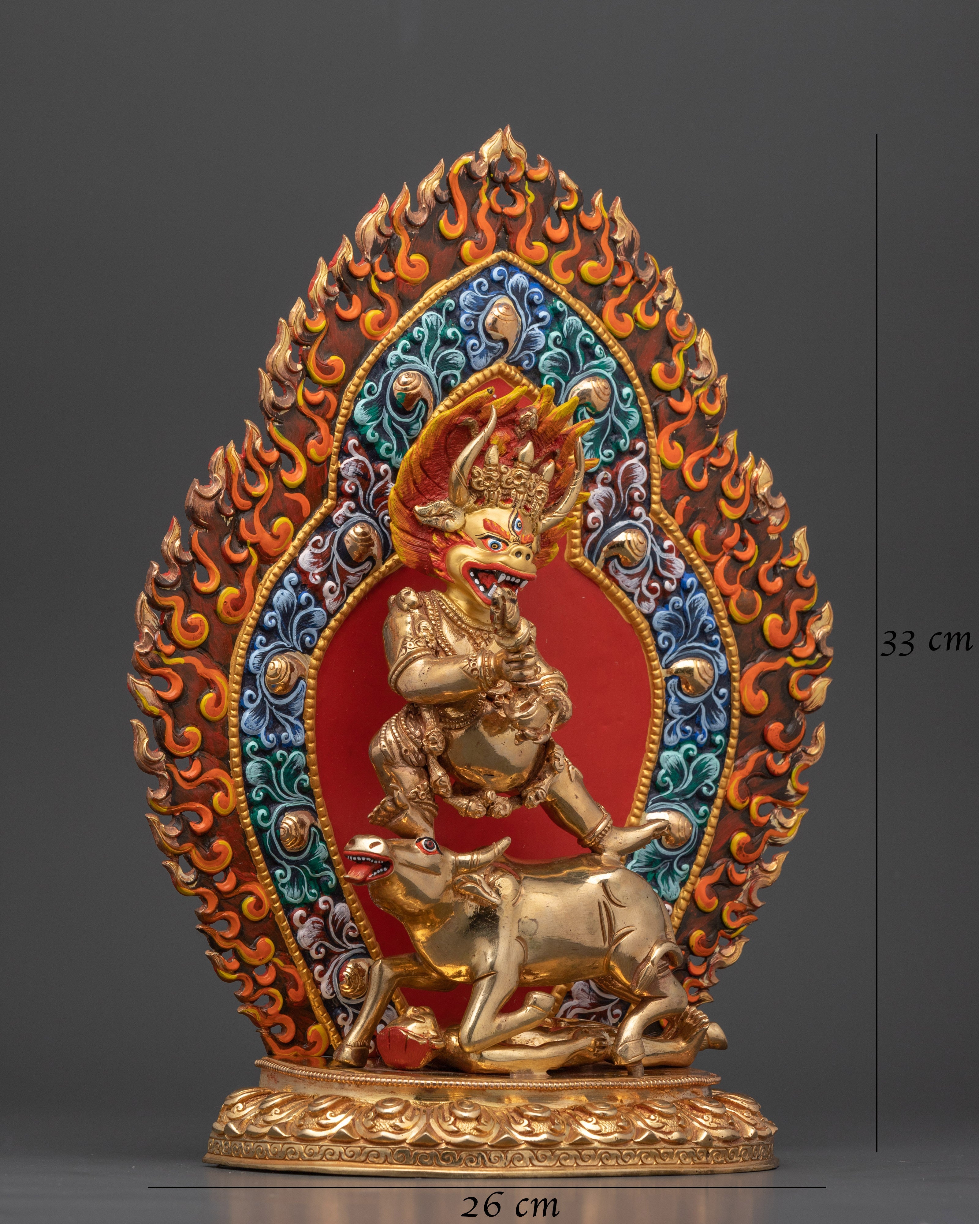The Yamantaka Destroyer of Death Statue is a menacing depiction of the strong god renowned for overcoming adversity and death to achieve enlightenment. This painstakingly constructed statue, which stands 13 inches (33 cm) tall and has a base width of 10.2 inches (26 cm), is composed of a solid copper body and is adorned with fine gold and acrylic paints and 24K gold gilding to capture the ominous presence and minute details of Yamantaka.