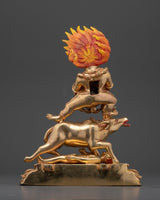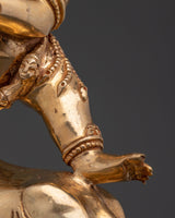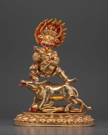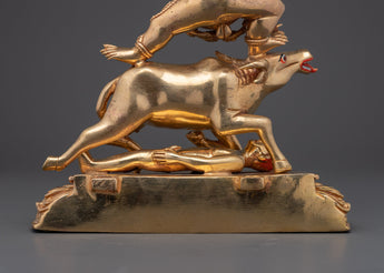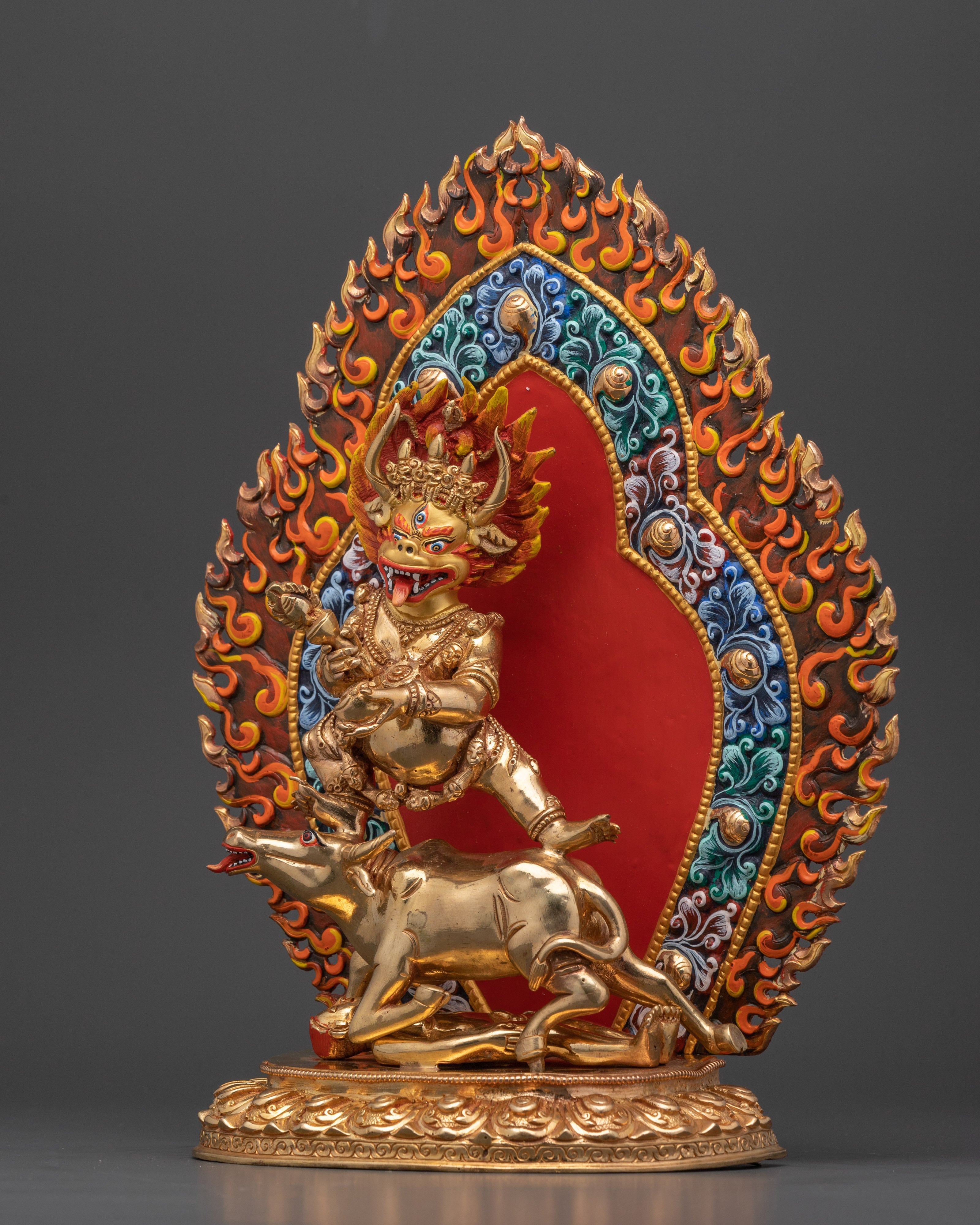 Yamantaka, the "Destroyer of Death," is a furious manifestation of the wisdom bodhisattva Manjushri. His three blazing eyes on top of his head represent his omniscience and his capacity to look into the past, present, and future. Yamantaka's dynamic stance as he crushes the forces of negativity is depicted in rich detail in the statue, representing his position as a strong force against the ego and the circle of suffering.