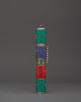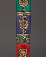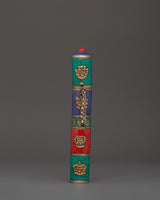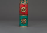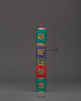 Enhance meditation and spiritual activities with our Auspicious Symbol Incense Holder - Handcrafted Tibetan Brass Burner. This incense holder, made of brass with copper accents, is artistically fashioned with auspicious symbols representing blessings, protection, and spiritual harmony. The colorful artificial stones of coral and turquoise lend a sense of traditional Himalayan style. This incense holder is stylish and useful, measuring 22cm high and 3.5cm wide and weighing 0.16 kilogram. It emits peaceful scents and represents good fortune and positive energy, making it ideal for meditation, yoga, spiritual ceremonies, and mindfulness practices. Its small size and intricate craftsmanship make it a perfect complement to any altar, yoga area, or home decor collection.