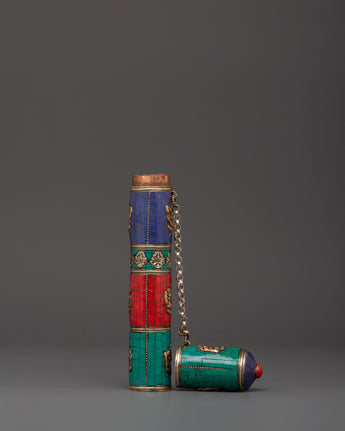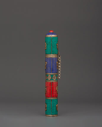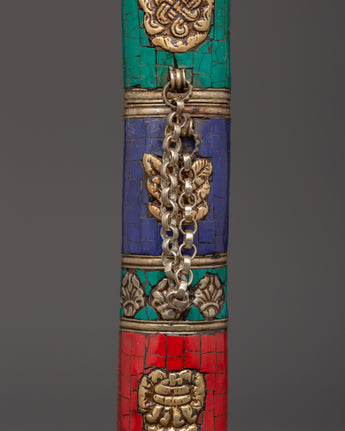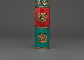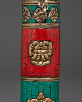 This Tibetan brass incense burner is an essential and aesthetically pleasing spiritual instrument. The auspicious motifs carved on the surface reflect the rich cultural history of Himalayan workmanship, while the mix of coral and turquoise represents harmony and calm. Whether used as a decorative incense holder or a ritual burner, it adds to the mood with relaxing scents and thoughtful design. This handcrafted piece is ideal for spiritual practitioners, yoga enthusiasts, or anybody wishing to bring a bit of sacred tradition into their home. It is both a practical tool and a meaningful present.
