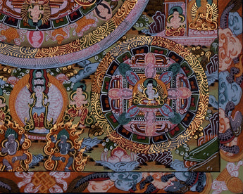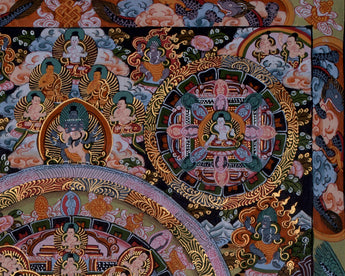 Additionally, four smaller mandalas adorn the corners of the thangka, each representing various aspects of Buddhist cosmology. The mandala is bordered by intricately detailed dragons, symbolizing protection and power, and embellished with gold throughout, adding a captivating shine and enhancing the sacredness of the artwork.