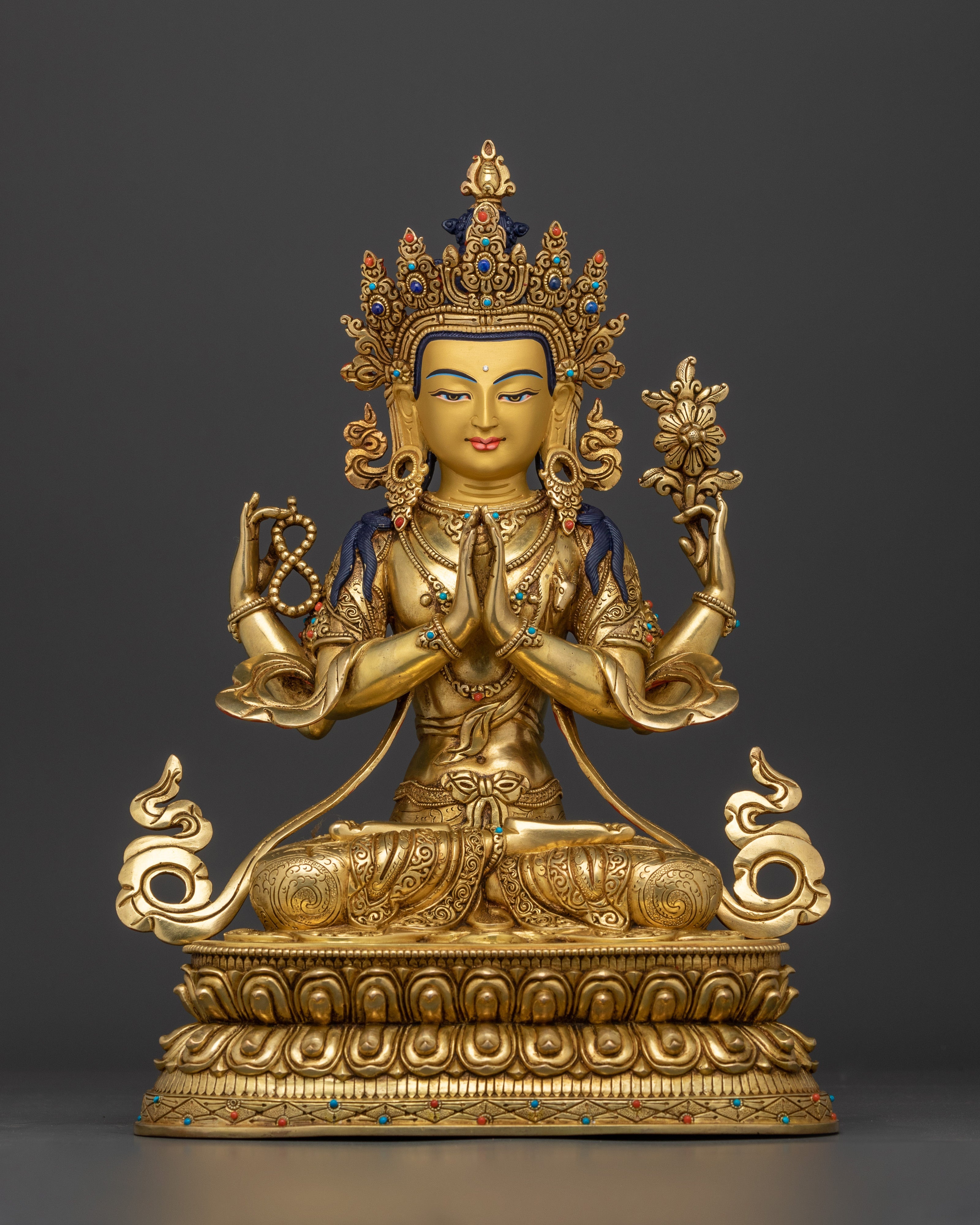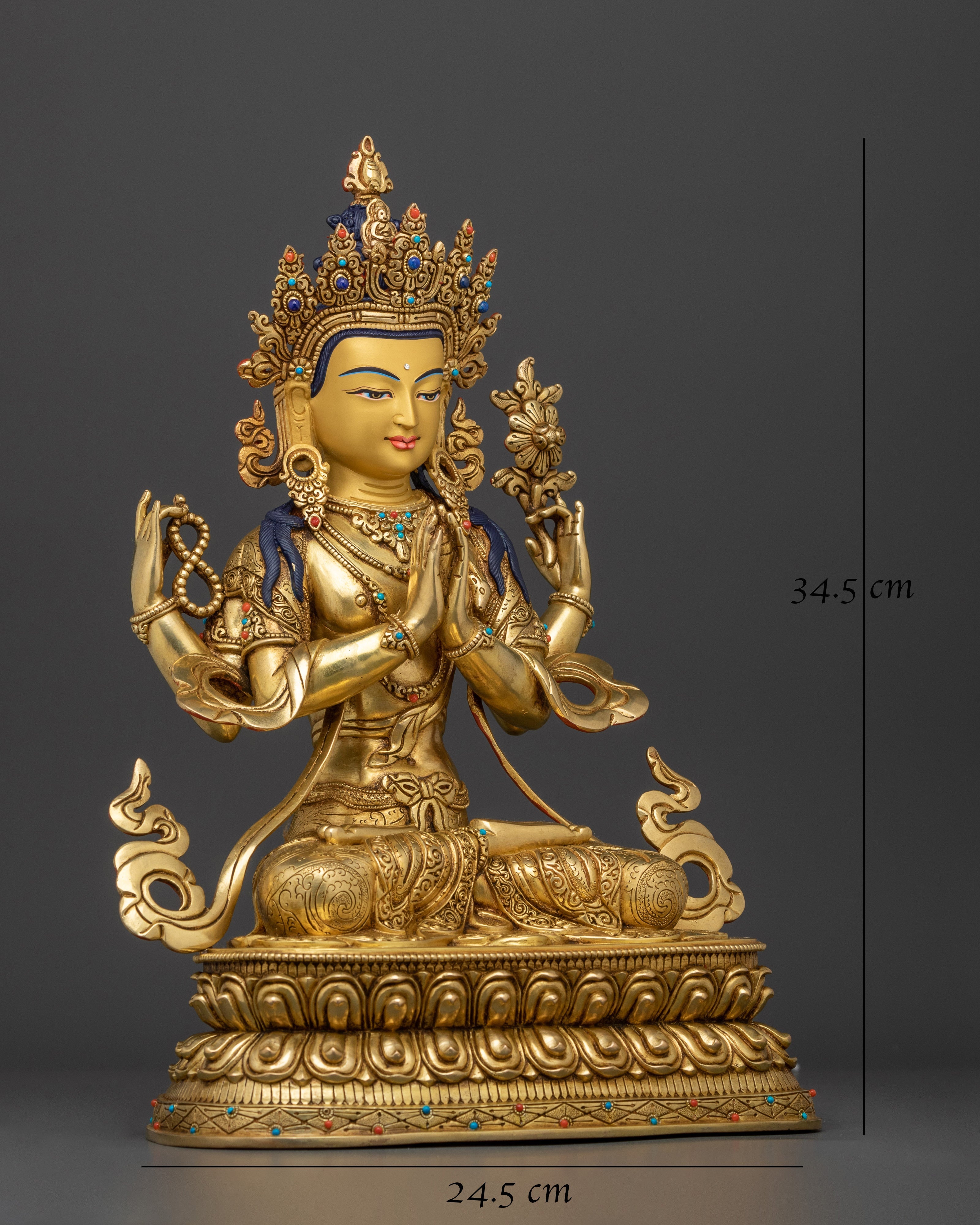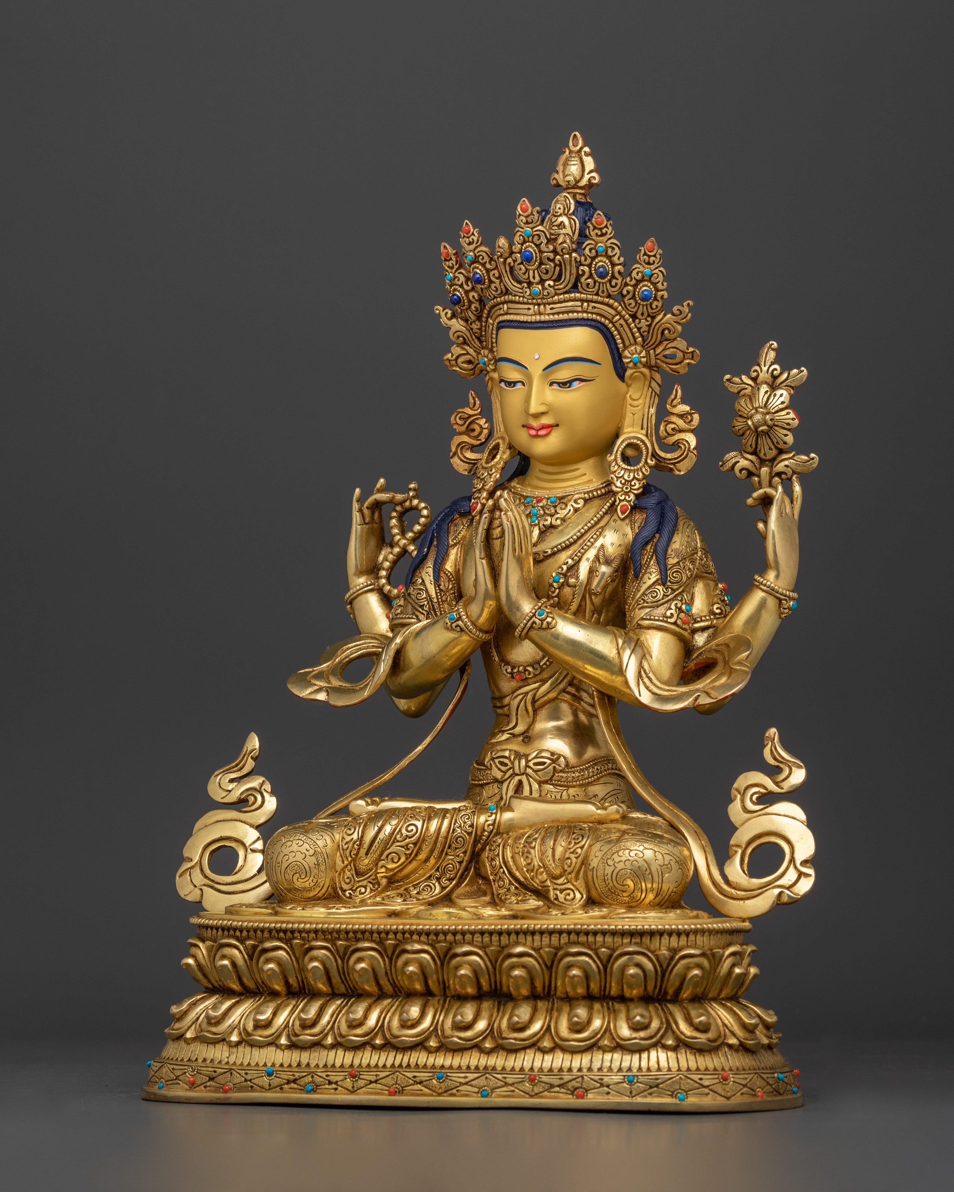 The Avalokita Chenrezig statue is a magnificent representation of the Bodhisattva of Compassion, delicately carved from copper and gilded with 24K gold, accented with elaborate gold and acrylic paintings and fine gemstone accents. Chenrezig, the four-armed deity, is known for his infinite compassion for all sentient beings. He carries a lotus flower, a mala (prayer beads), and a wish-fulfilling jewel, which represent wisdom, meditation, and unconditional love.
