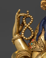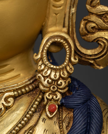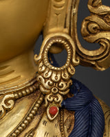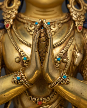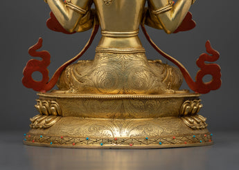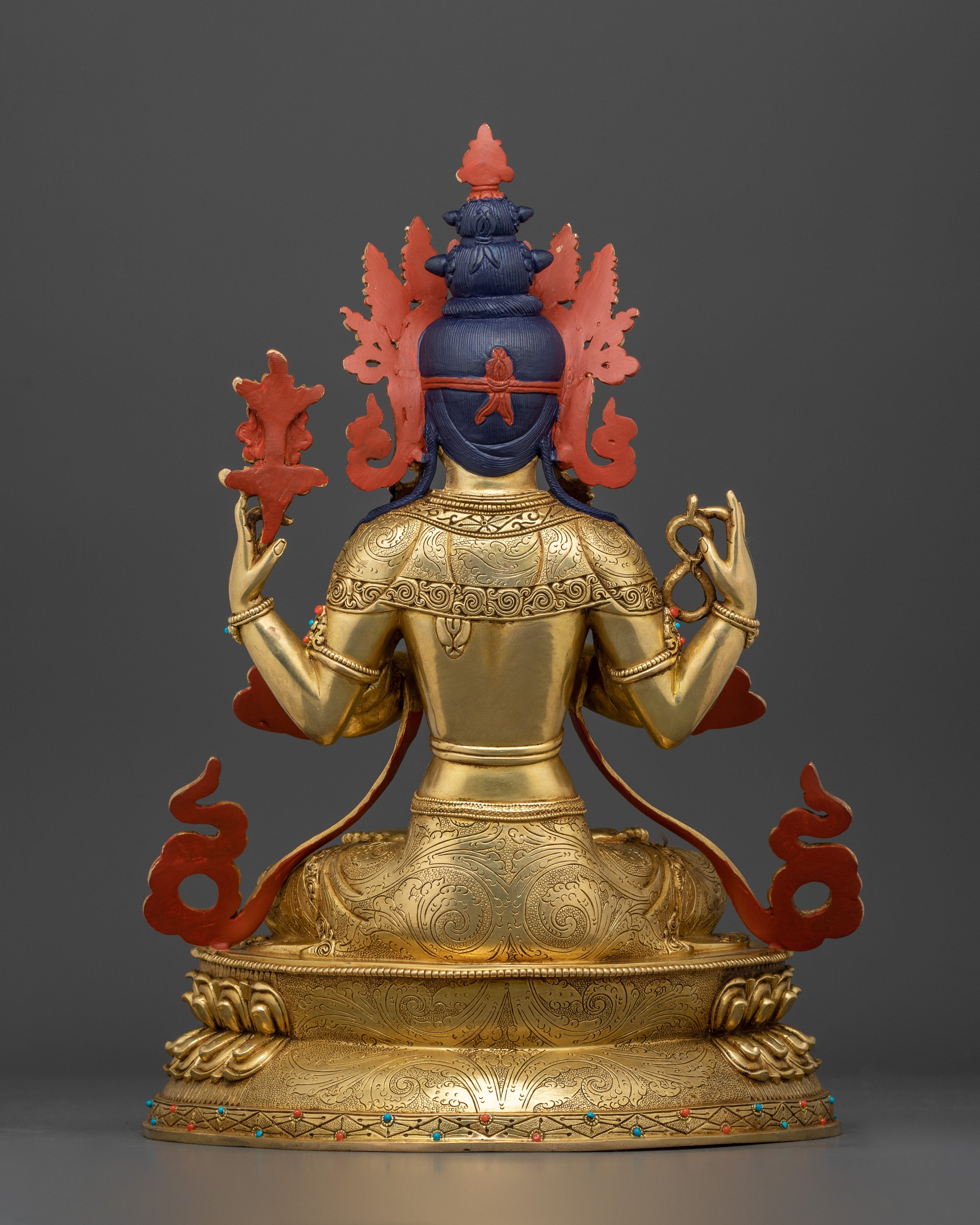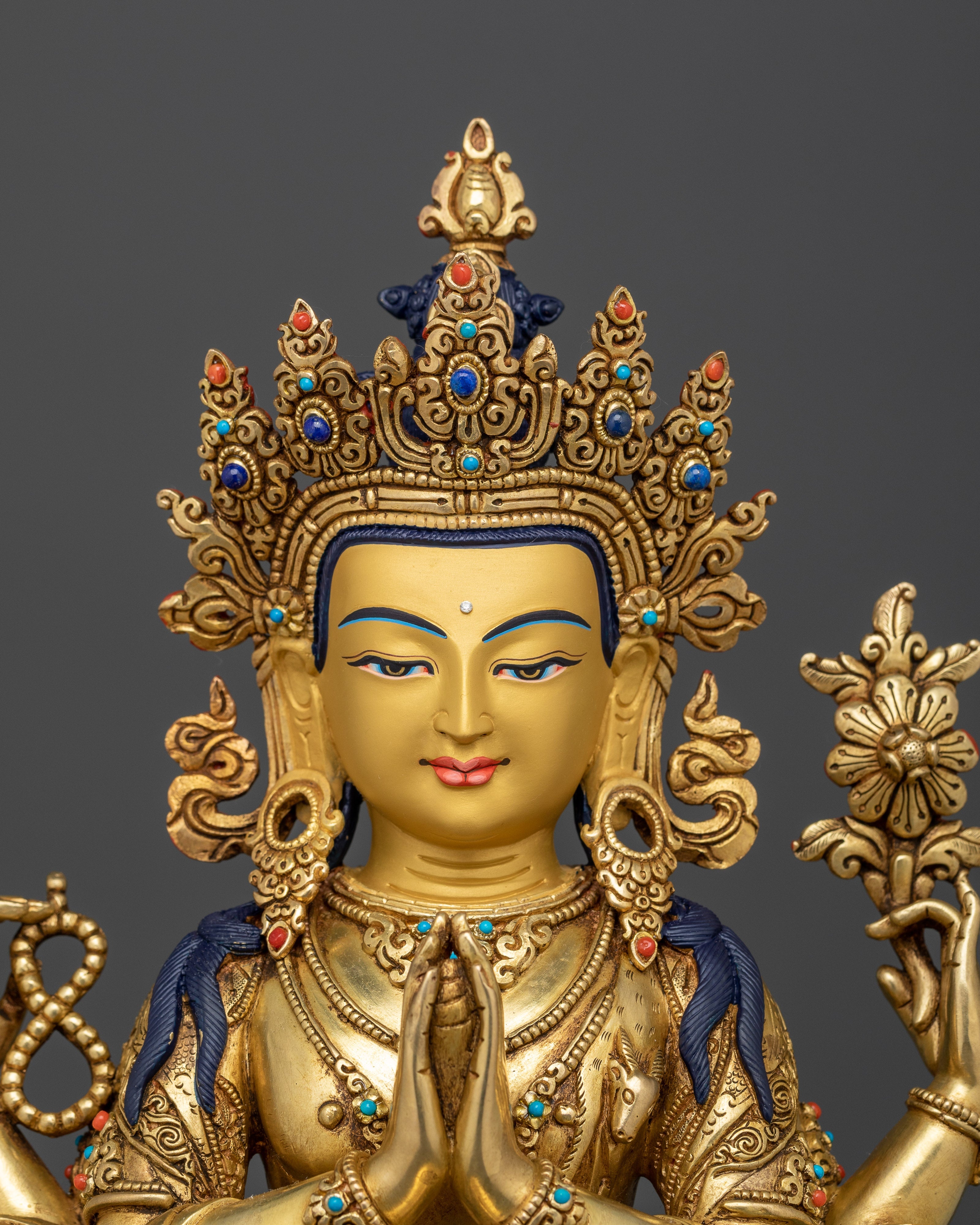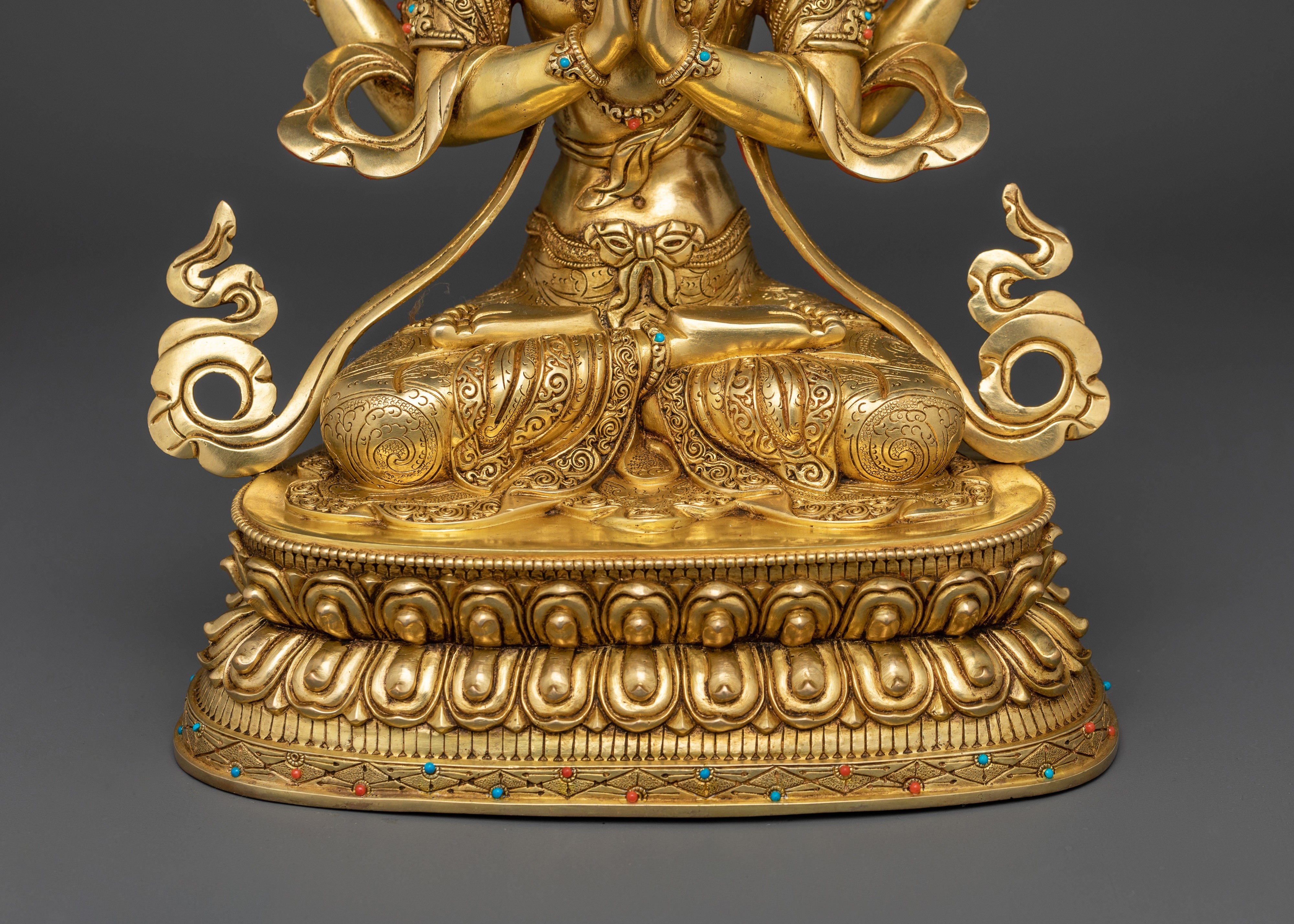 The Avalokita Chenrezig statue is a magnificent representation of the Bodhisattva of Compassion, delicately carved from copper and gilded with 24K gold, accented with elaborate gold and acrylic paintings and fine gemstone accents. Chenrezig, the four-armed deity, is known for his infinite compassion for all sentient beings. He carries a lotus flower, a mala (prayer beads), and a wish-fulfilling jewel, which represent wisdom, meditation, and unconditional love.