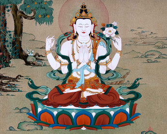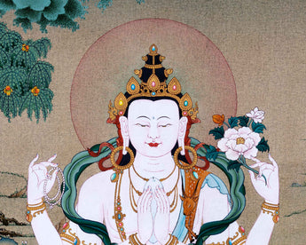 With decades of expertise in Thangka art, we have artistically hand-painted Avalokiteshvara Buddha Thangka based on a meditational manual. For the painting process, we used cotton canvas and acrylic colors. In the art, Chenrezig is seated on a moon disc lotus seat having four arms. His first two hands are clasped around his heart, palms together, holding a wish-fulfilling stone. His right hand's third hand is holding a crystal rosary, which represents knowledge. On his left hand, he has a lotus, which signifies compassion. This thangka will empower you during meditation or yoga and on many Buddhist occasions. The art of Nepali thangka has been passed down through the generations as a reflection of Buddhism. This artwork will be a perfect gift for practitioners like you to practice the Chenrezig mantra.