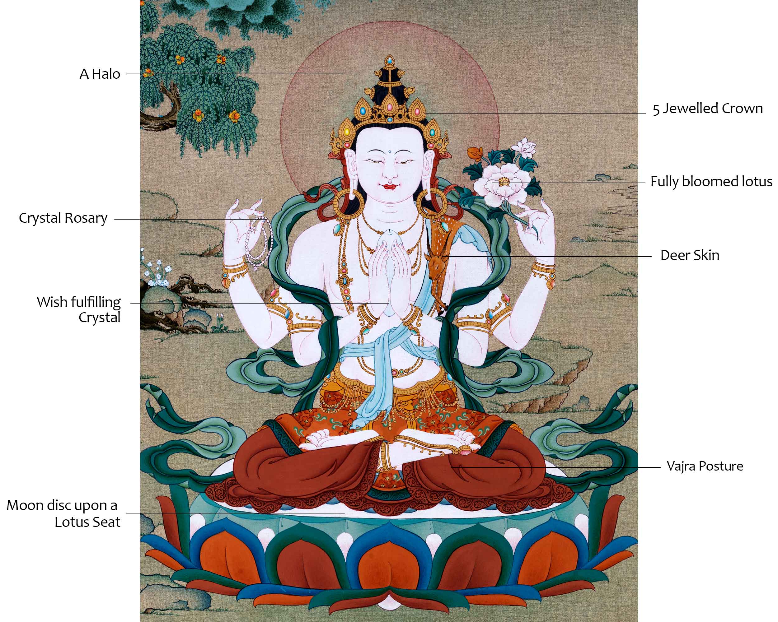 Chenrezig is the most respected Bodhisattva, embodying all Buddhas' compassion. He is also known as Avalokitesvara, or "One Who Looks With Unwavering Eye." In times of struggle and difficulty, he listens to the pleas of all sentient beings. His two front hands clasp in front of his jewel-draped heart in a religious gesture. He wears a crystal akshamala, or rosary, signifying the never-ending cycle on his upper right hand. His left hand is holding a white lotus, meaning that he frees aware beings from the muddy streams of anguish and hellish regions, leading them to greater levels of enlightenment. He's draped in silk and sits on a row of lotus petals, his legs in the "diamond position" of meditation.
