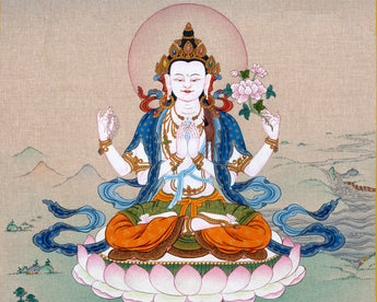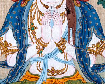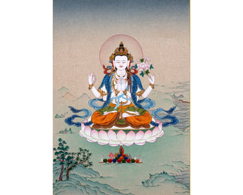 Chenrezig is one of the most popular Bodhisattva in Vajrayana. It is celebrated and placed among the heart of every Tibetan Himalayan community. The practice of Avalokiteshvara is encouraged to develop a calm and compassionate heart. Compassion is the root foundation for excelling in the Buddhist path. Kind, Calm, and Open Mind is only possible if we are forgiving. Avalokiteshvara Thangka is used in visual meditation to develop a calm, kind, and compassionate heart.