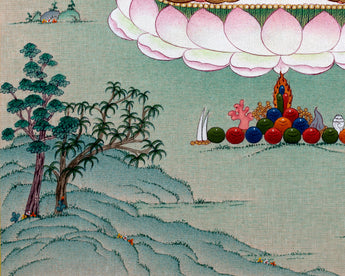 The Chenrezig Buddha, known as Avalokiteshvara(in Sanskrit) Thangka, portrays the calm and compassionate deity seated on a lotus seat. He is holding a wish-fulfilling gem in his sadhana, covered by both fists together. The other left hand has the bloomed, semi-bloomed, and unbloomed lotus stem. The right hand is holding a crystal rosary. The green hills and trees and the flowing water stream represent harmony and balance in life.