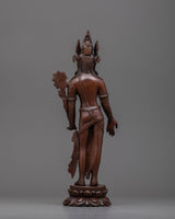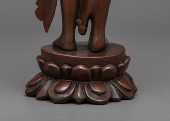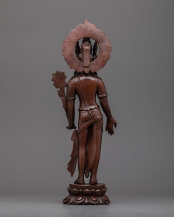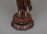 The statue, carved from oxidized copper, has a vintage, ageless appeal. The deeper color enhances the intricate craftsmanship, emphasizing Avalokiteshvara's tranquil expression and balanced attitude. The slim base adds to its beauty, making it an ideal centerpiece for your religious place.
