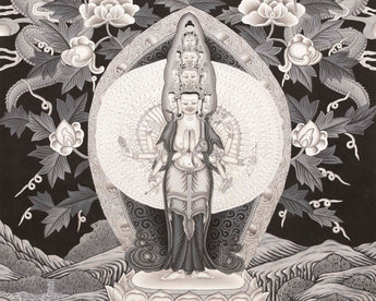 Avalokiteshvara Thangka flanked by Green and White Tara | Original Hand Painted Black & White Newari Style Bodhisattva Thangka