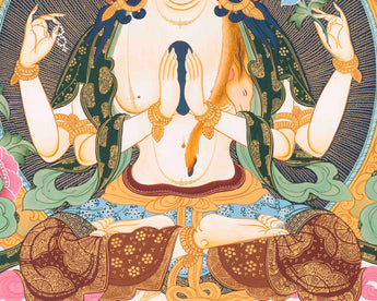 Chenrezig is gracefully seated in meditation posture surrounded by fully bloomed flowers in this four-armed Avalokiteshvara thangka. This high-quality bodhisattva art portrays Chenresig folding his two hands in a devotional gesture. The upper right hand holds the never-ending cycle, akashamala, and his upper left-hand holds a white lotus.