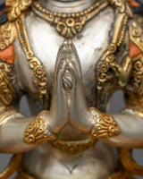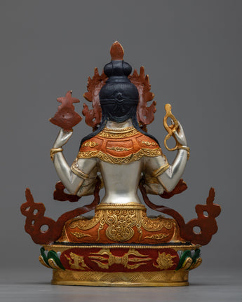 The compassionate being is shown seated atop a moon disc of a lotus seat, handcrafted by a Nepali artist. In the praying position, his two front palm arms are united, holding the wish-fulfilling jewel. He carries a lotus flower in his other left hand and a crystal mala (rosary) in his other right hand. The statue is built on a copper base and then electroplated and acrylic paint.