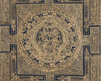 Lokeshvara is also the spiritual father of White Tara and Green Tara who were said to be formed from his two drops of tears when he saw the pain and suffering in the sentient beings. They are all boddhisattvas (liberators of the sentient beings from pain and suffering ) who have very prominent spots among the Tibetan Deities.He is residing here inside a Mandala which is a tool for liberation .