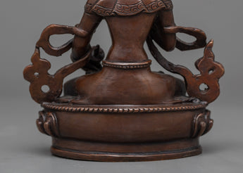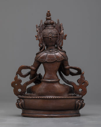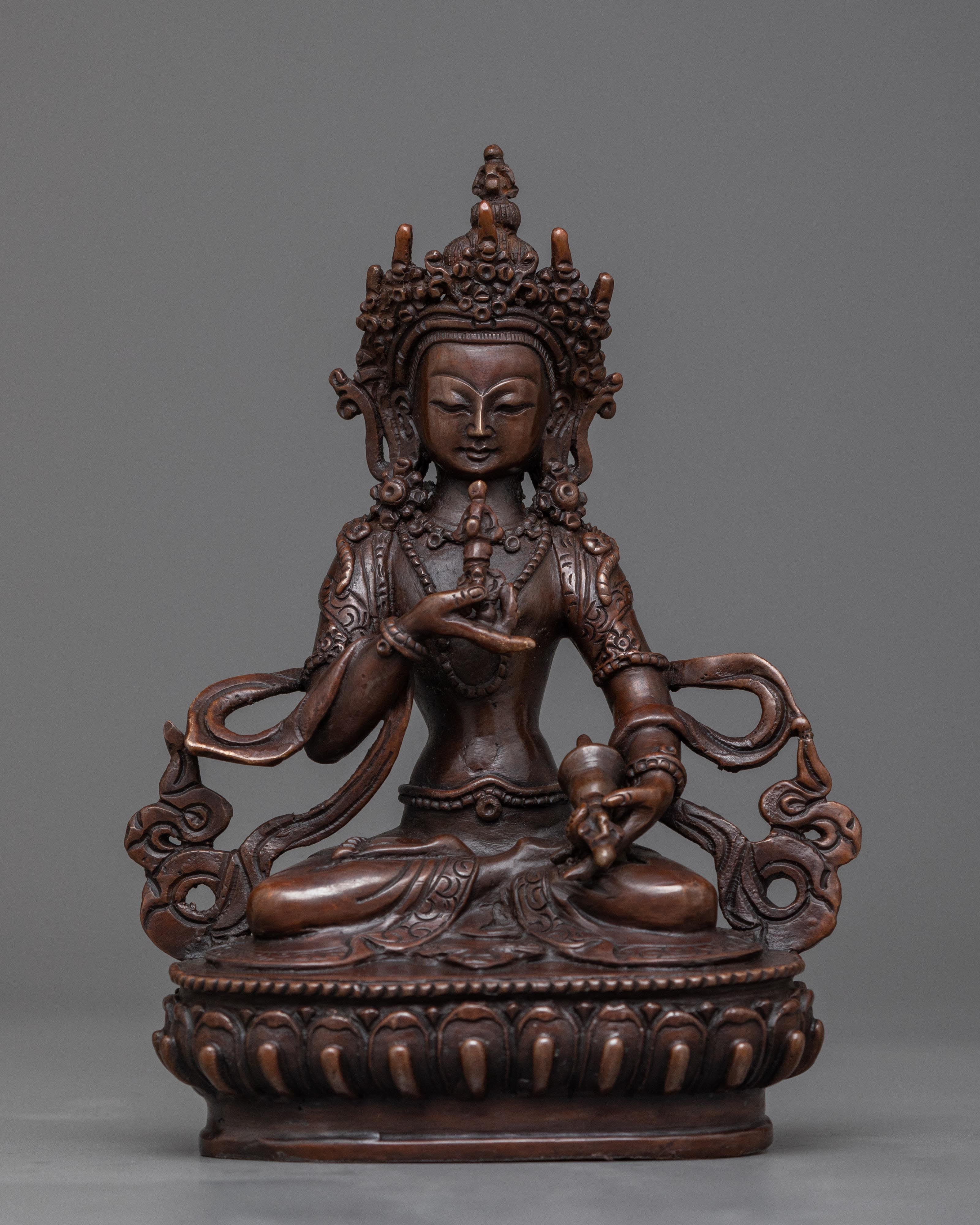 This sculpture is meticulously shaped from high-quality oxidized copper, chosen for its enduring nature and the beautiful, aged patina it acquires over time. The oxidization process enhances the depth and detail of the craftsmanship, allowing Vajrasattva's tranquil expression and intricate iconography to shine. It is a constant reminder of the purity and clarity achievable through diligent practice and mindfulness.