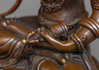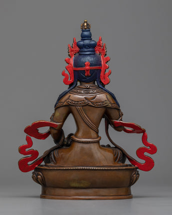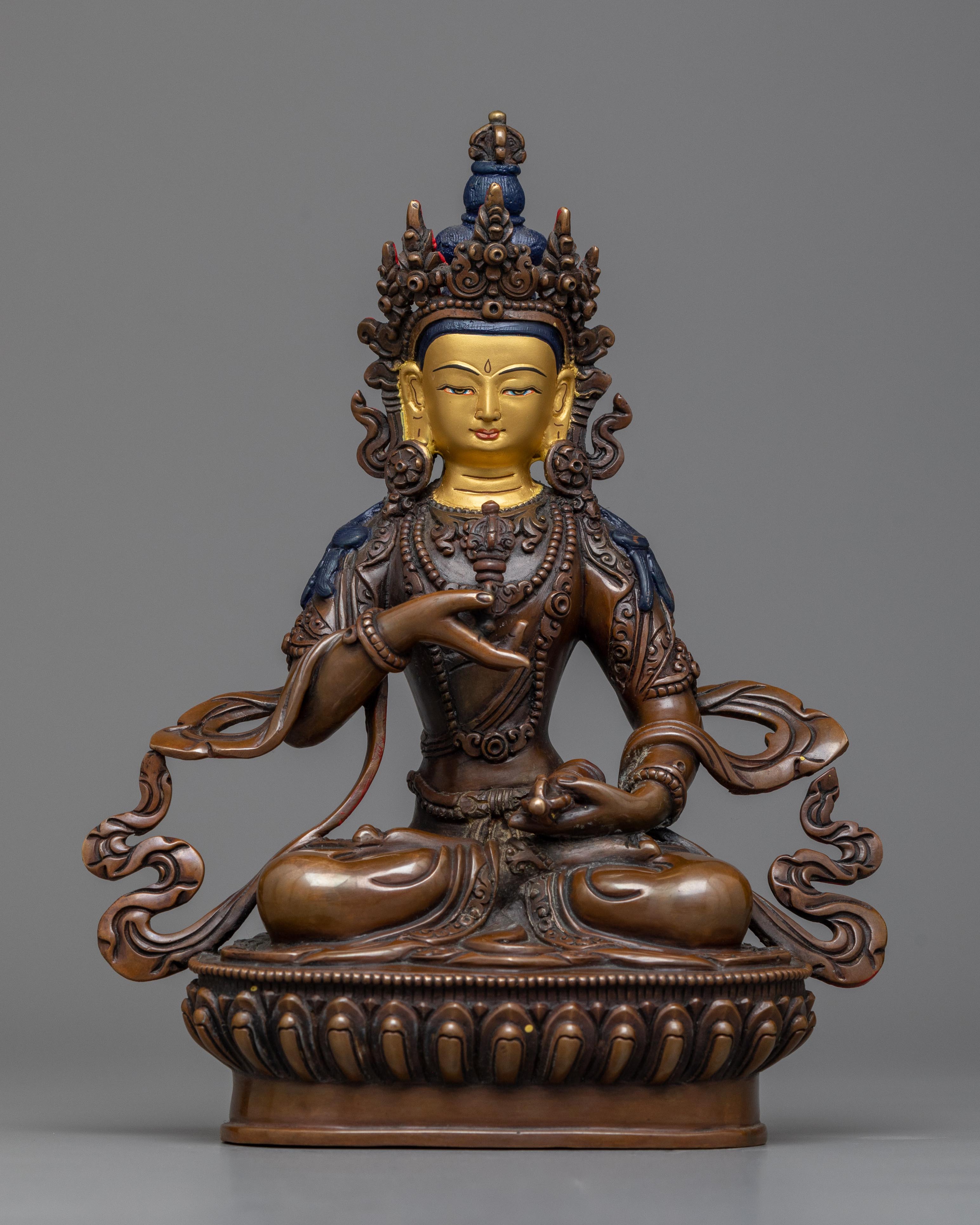 The statue's oxidized copper body and deep, antique-like finish add to its spiritual grandeur. The oxidization process highlights the complex gold and acrylic paintings, emphasizing Vajrasattva's delicate features and symbolic traits, such as the vajra (thunderbolt) he wields, representing spiritual power and unbreakable clarity.