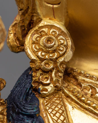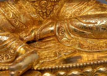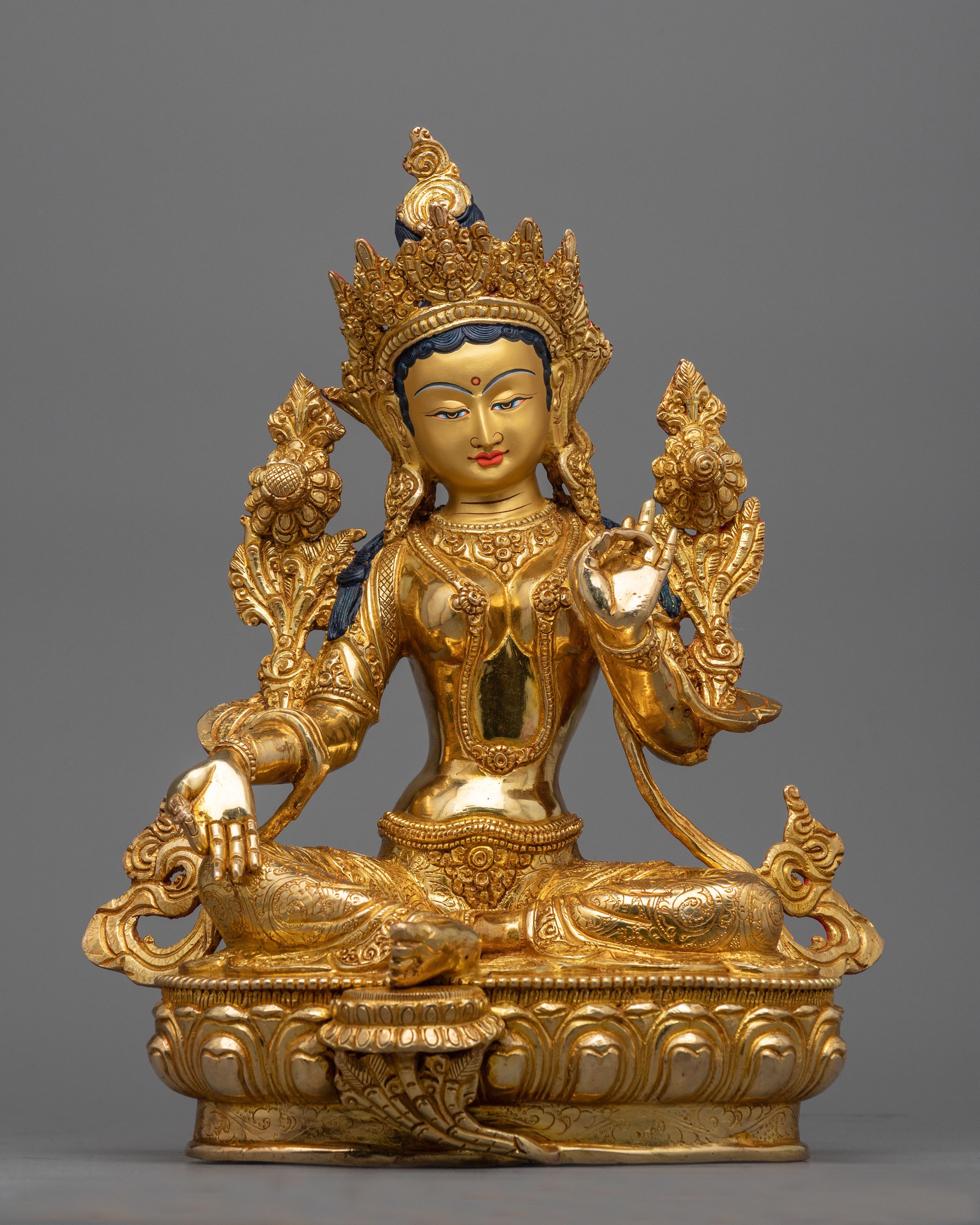 With one leg outstretched and ready, Green Tara is portrayed in her well-known stance, signifying her determination to act quickly to aid her believers. Her hands, in the gesture of granting boons and the mudra of compassion, further express her benevolence and her role as a guardian against physical and spiritual obstacles. The 24K gold gilding illuminates her divine form, casting a luminous aura that enriches any spiritual or contemplative space. The intricate gold and acrylic paintings bring depth and vitality to her compassionate expression and ornate attire, inviting admiration and reflection on the path to overcoming obstacles with wisdom and grace.