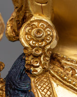 The Green Tara statue is made of copper, a magnificent representation of the female Bodhisattva renowned for her compassion, quick thinking, and protection of all living things. This monument, which stands serenely at 13.5 inches tall with a base of 10.2 inches and weighs 4.92 kg, embodies Green Tara's kind nature and her willingness to help those in need. This item, made of a copper body and embellished with 24K gold gilding and intricate gold and acrylic paints, represents Green Tara's unbounded compassion and graceful protection.