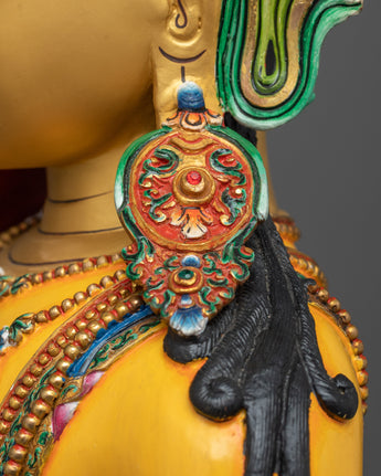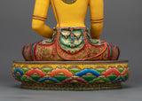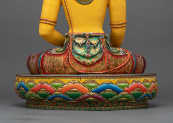 Shakyamuni Buddha is shown wearing a crown in this unusual depiction, signifying his universal kingship over Samsara, the cycle of birth and rebirth, as well as his function as a spiritual monarch who leads beings toward freedom with compassion and wisdom. The 24K gold gilding enhances the statue's divine presence, illuminating the sacred space it occupies, while the detailed gold and acrylic paintings bring depth and vibrancy, highlighting the Buddha's compassionate gaze and the rich iconography associated with his enlightened state.