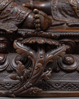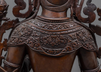 The Beautiful Green Tara Sculpture in Traditional Nepal Art was artistically hand-carved by us, utilizing a traditional Himalayan sculpting method. With a contented look and a lotus in each palm, we portrayed the female Buddha sitting atop the moon disc lotus throne. The body is made of oxidized copper body. We spent more than a month working in our workshop to create the hand-craving for pattern designs on the statue's crown, utpala, and robe. This statue may be utilized for several Buddhist rites and regular exercises like yoga and meditation.