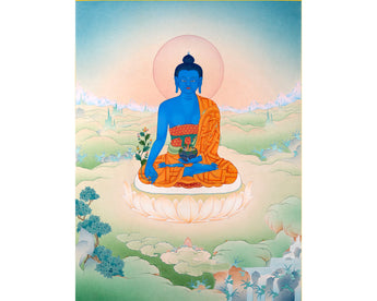 Medicine Buddha is one of the eight healing buddhas presented in dark blue color. He is seated with a cross leg holding a bowl of healing nectars and with his right hand, a medicine portrayed in the thangka. Medicine Budhha is a precious healing practice meditation in Buddhism.