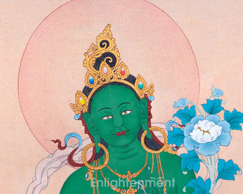 Note: Green Tara Thangka is an original painting from Enlightenment Studio, located at Boudha Stupa.