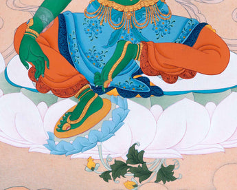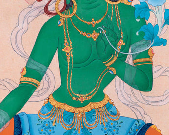 Using the traditional Himalayan method, we have artistically hand-drawn beautiful Green Tara has been hand-painted by our artist. The Great Mother Tara is depicted in lush green, seated gracefully with her left foot bent and right foot pendant but supported by a white lotus. Auspicious gems lie beneath her foot, and she holds lotus flowers in various stages of bloom in both hands. Her warm eyes, the green hills, and the waterfall from the white mountains all exude harmony. Alongside acrylic paintings, we have used genuine 24K gold to highlight the features of the deity as a finishing touch.