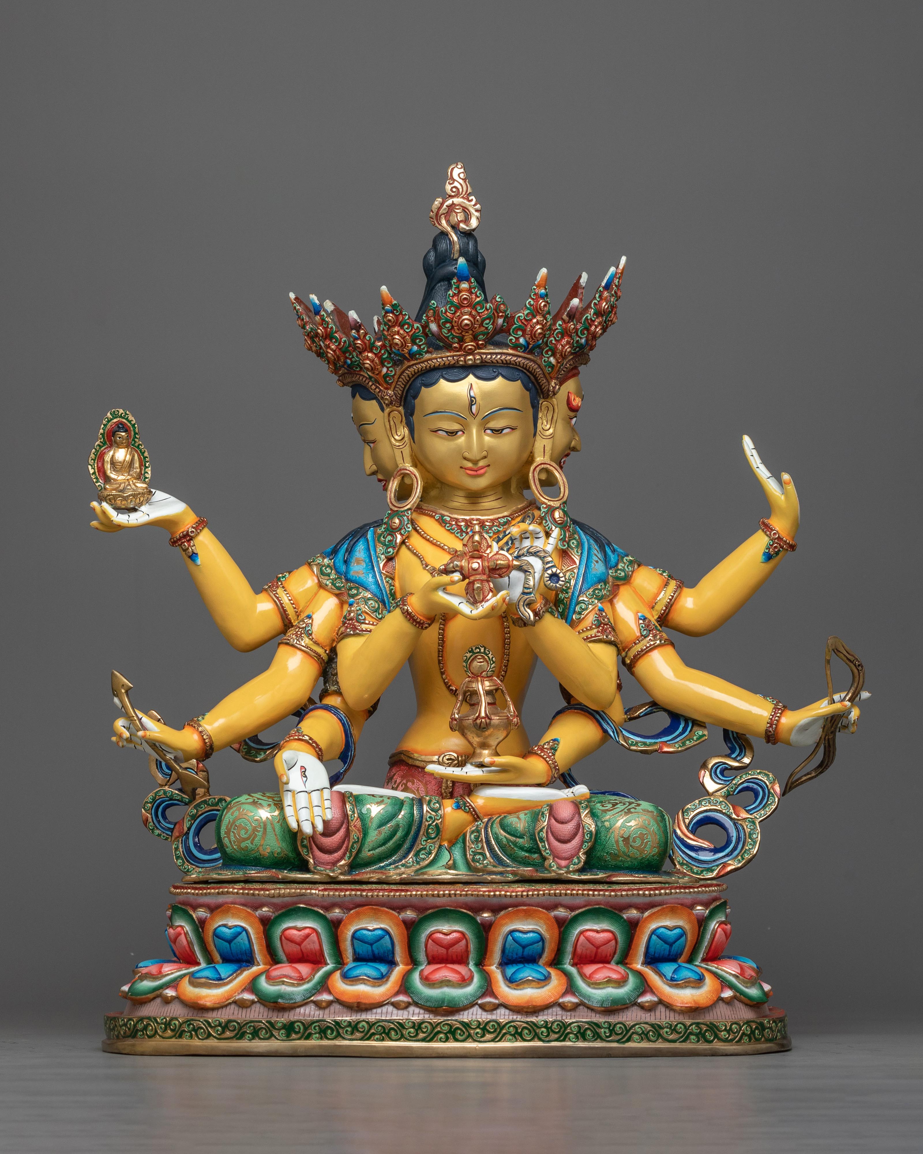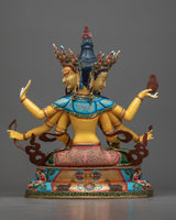 Namgyalma, also known as Ushnisha Vijaya, is a Mahayana and Vajrayana Buddhist deity praised for her ability to provide longevity, vanquish death, and purify negative karma. She has three faces and eight arms, each having symbolic traits that indicate her power to protect practitioners from various perils and extend their lives. Namgyalma's practice is especially revered for its ability to improve health, longevity, and mental purity. This statue is a powerful manifestation of these virtues, serving as a constant reminder of the possibility of spiritual growth and rejuvenation.