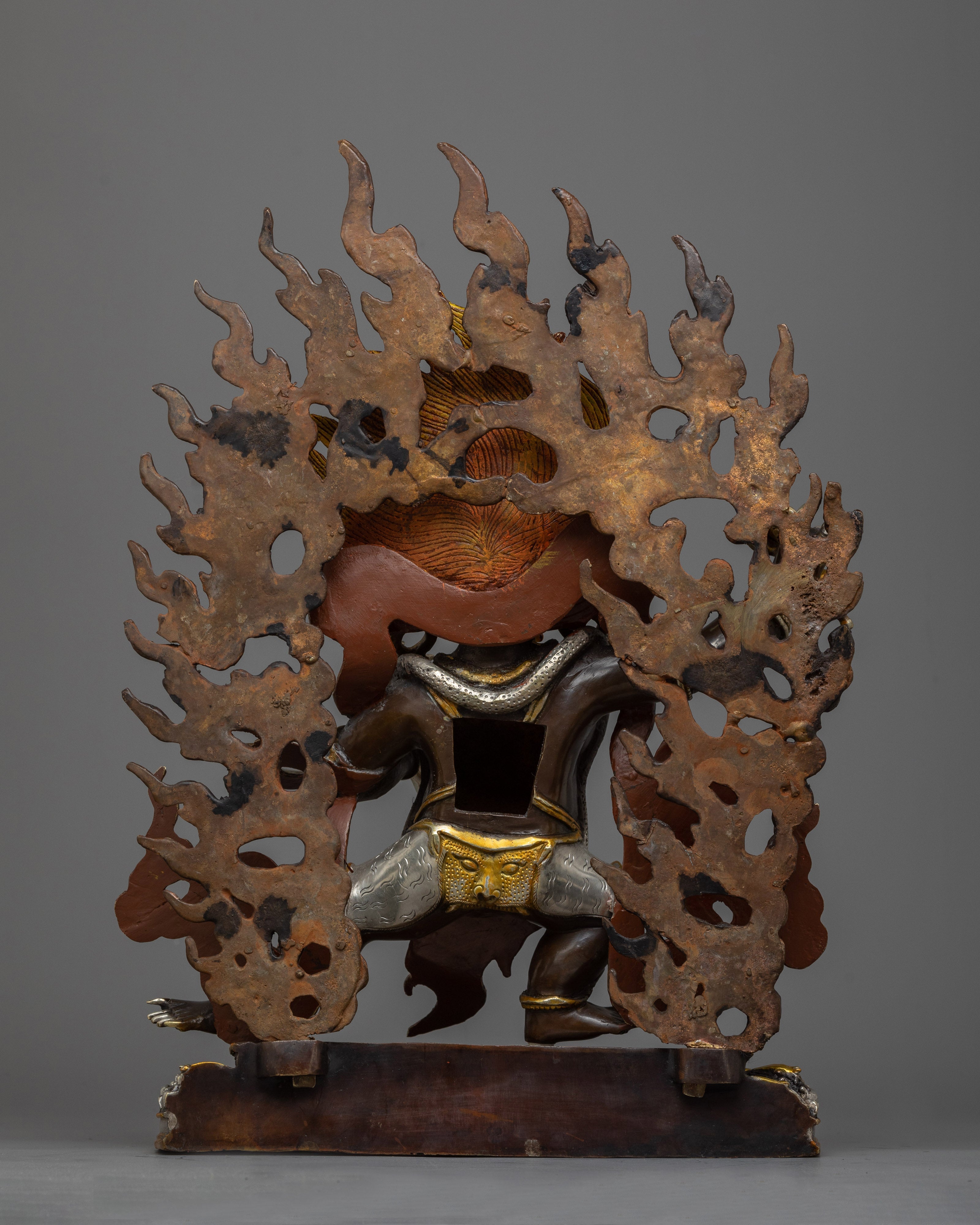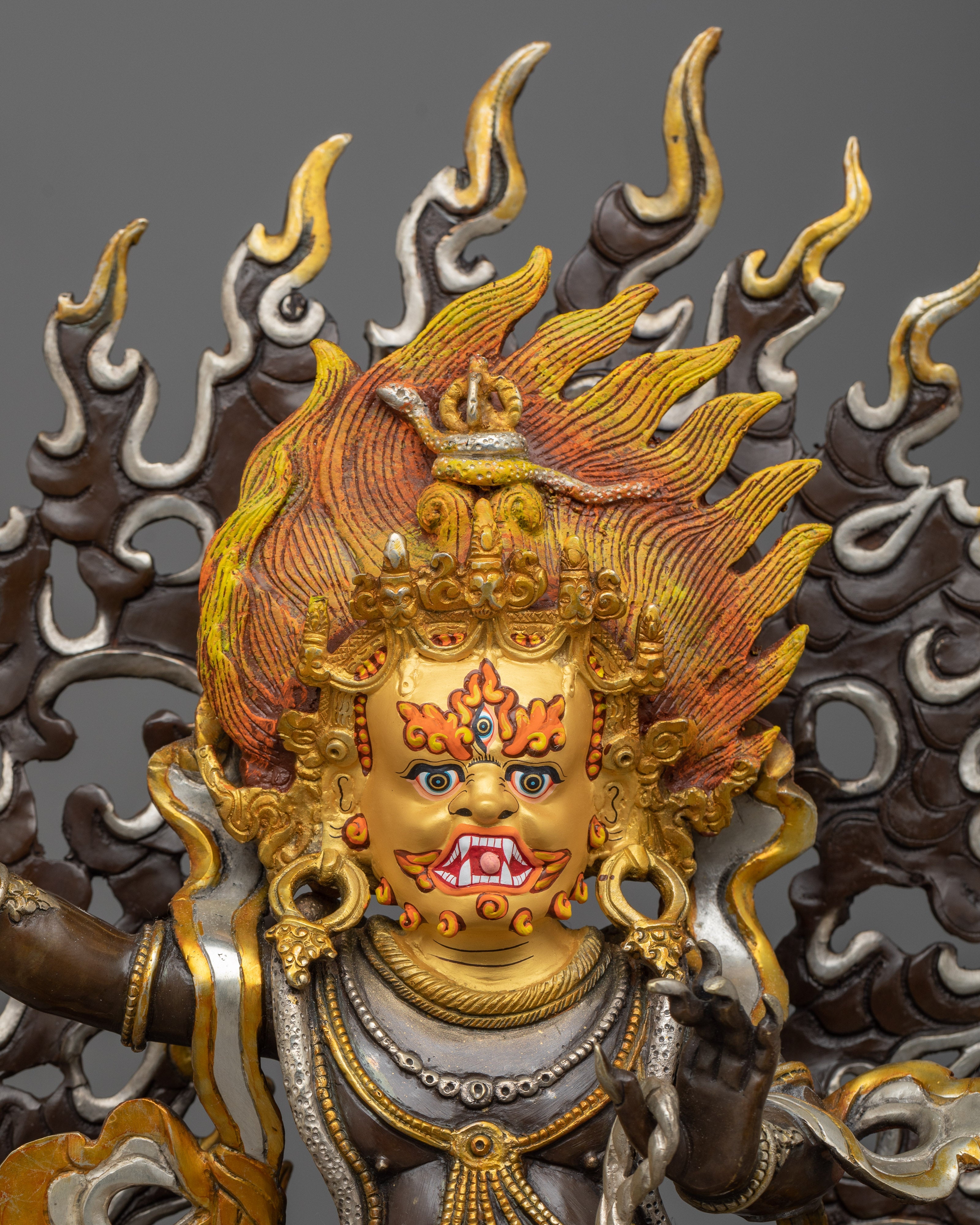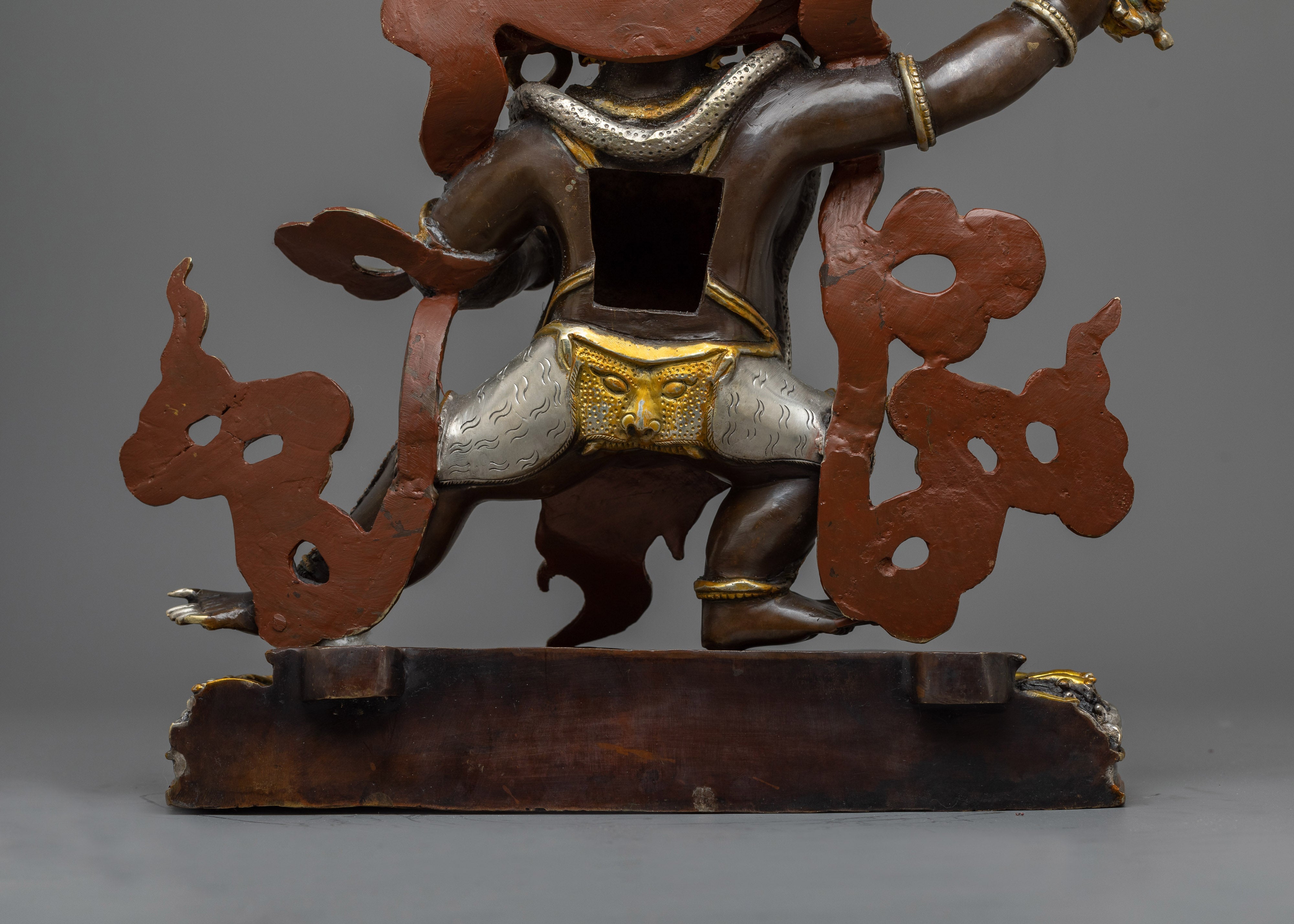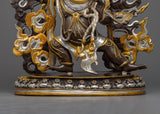 Known for his role in defeating obstacles and illusions, Vajrapani is portrayed in a dynamic pose that exudes an air of unstoppable strength and resolve. The combination of silver plating with the oxidized copper body illuminates his form, creating a striking contrast that enhances the statue's spiritual and aesthetic allure. The detailed gold and acrylic paintings bring depth and vibrancy to his expression and the symbolic attributes, inviting contemplation and reverence.