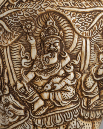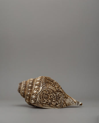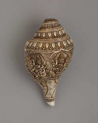 Tibetan and Hindu ceremonies use this handcrafted Shankha (beautiful conch shell) as a sacred instrument. The intricate Buddha engravings stand for knowledge, enlightenment, and spiritual awakening, a significant addition to meditation activities, prayer rituals, and holy presents. An important spiritual item for altars, temples, and individual meditation areas, this incredible and exquisitely carved conch shell measures 11.5 cm in height and 22 cm in width.
