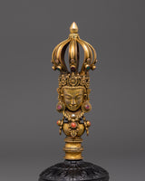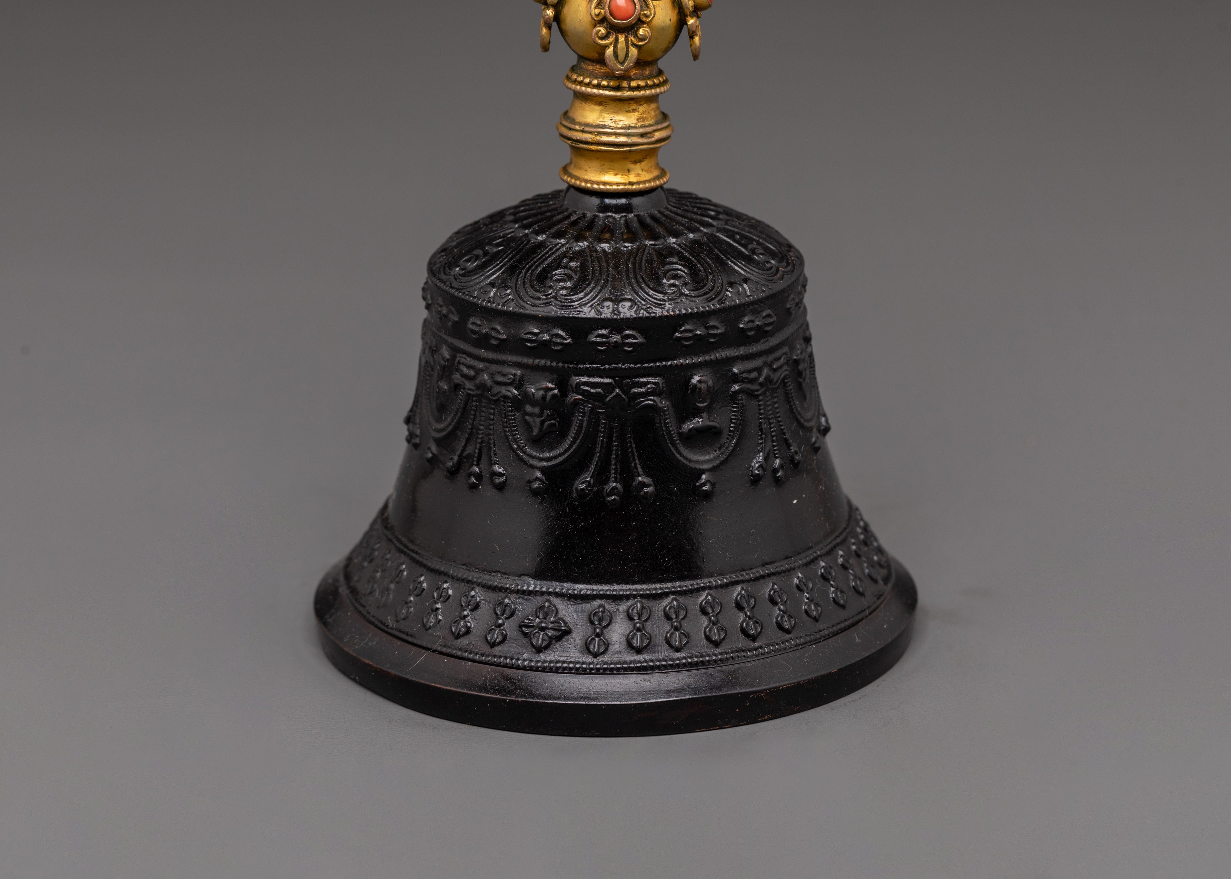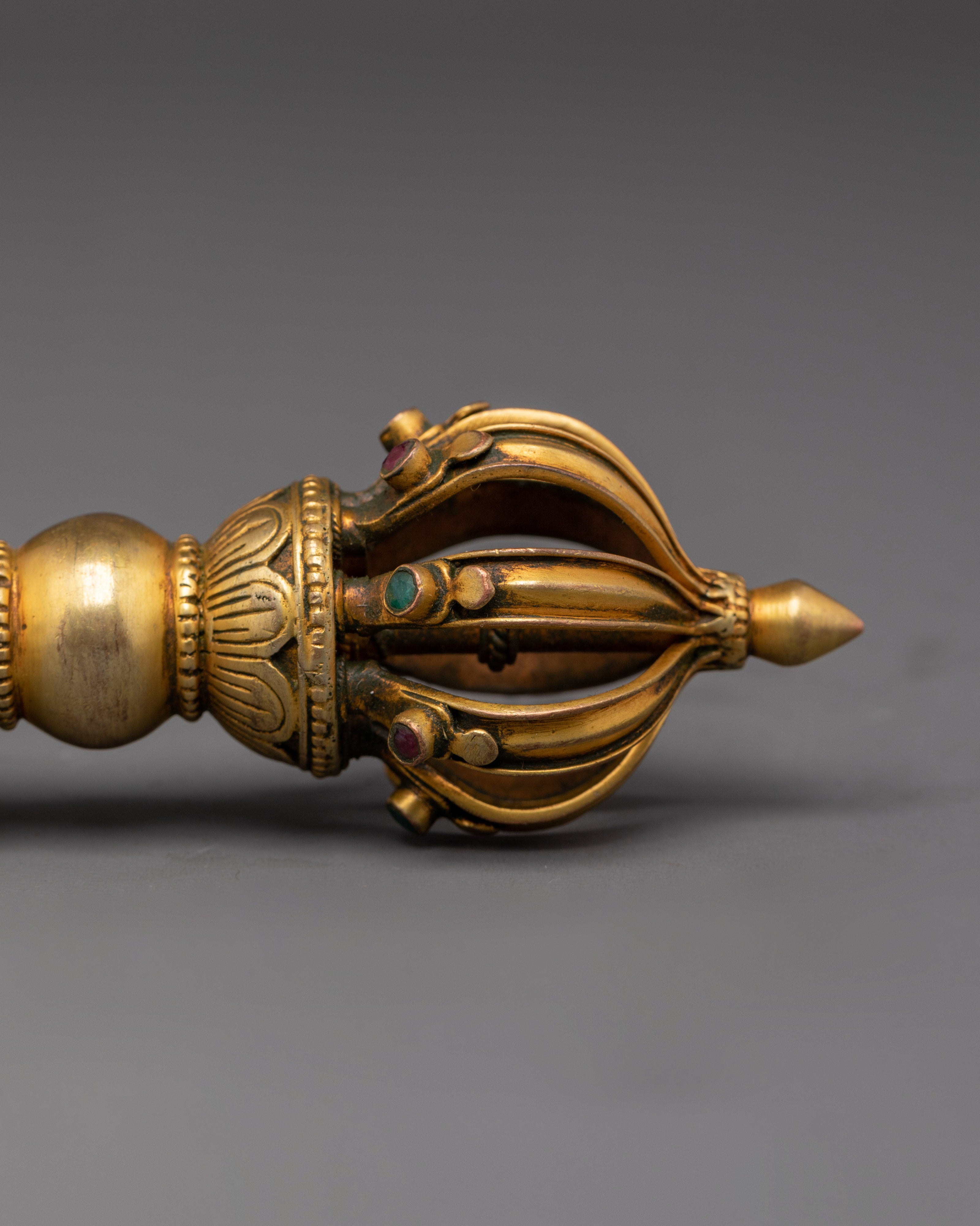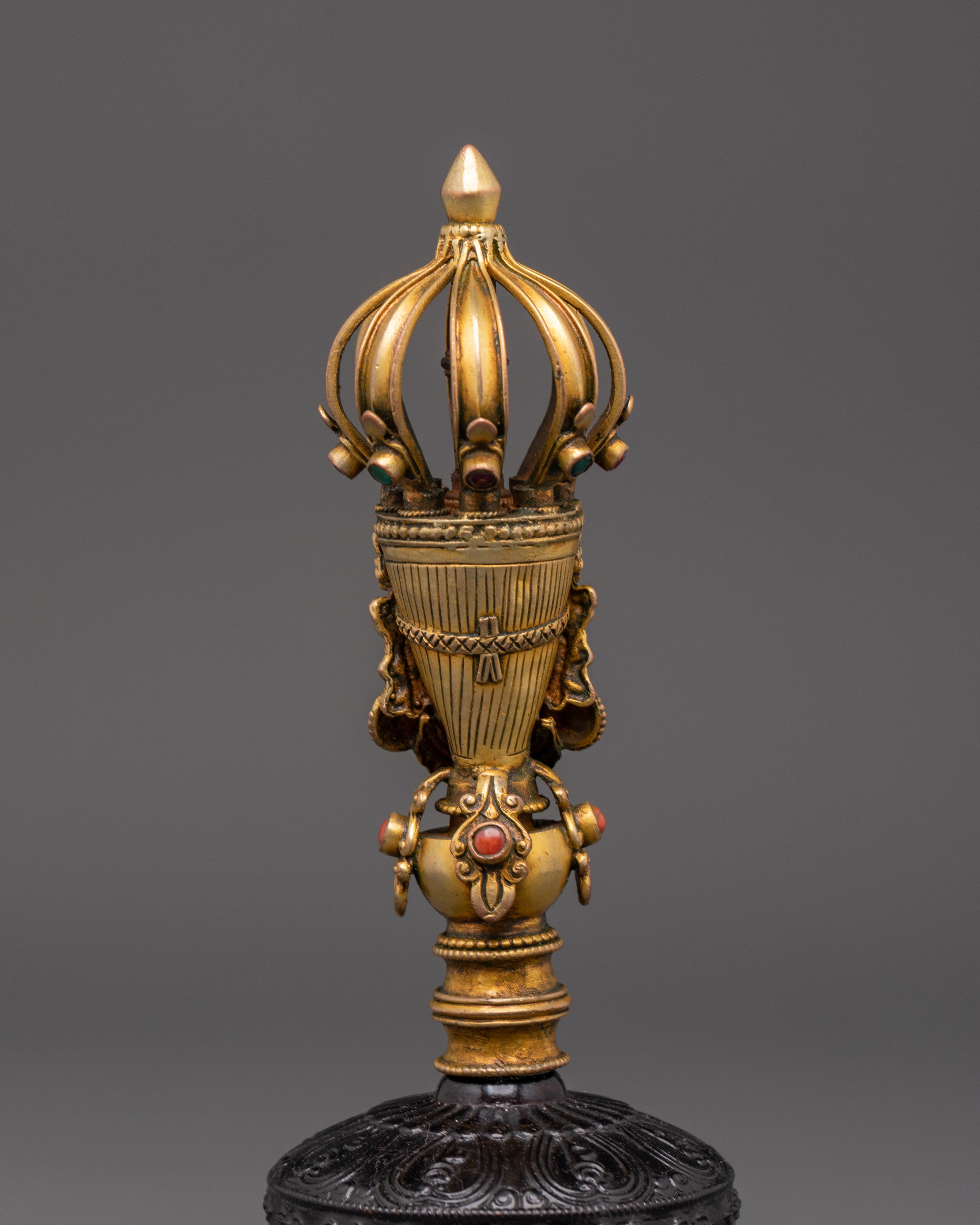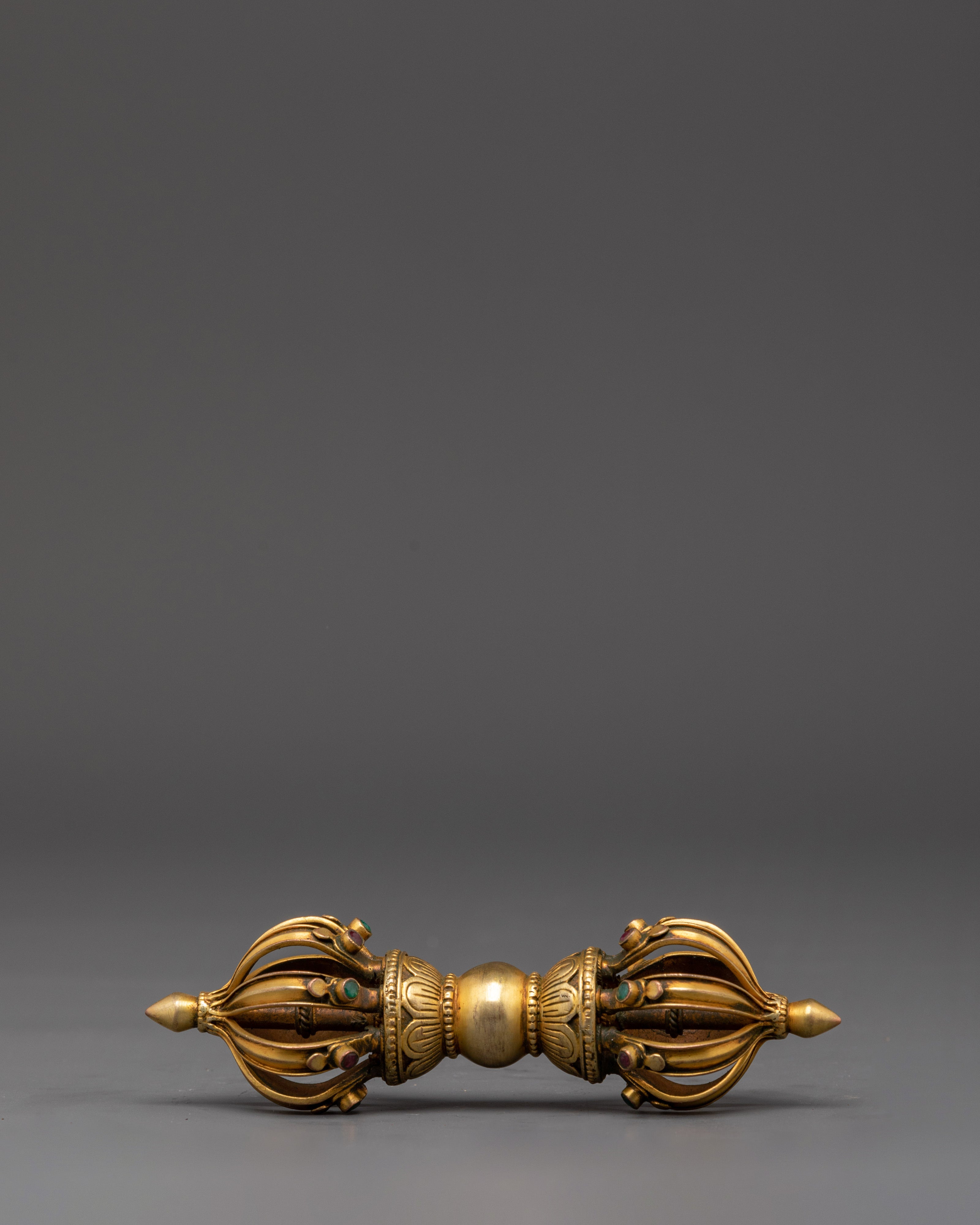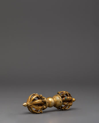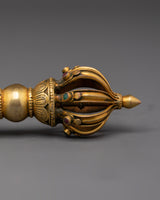 The Vajra, a sign of enormous spiritual strength, is present with the bell. This gold-plated Vajra, which measures 4 cm in height and 14.5 cm in width, represents indestructibility and the ultimate truth in Buddhist teachings. It is used in various ceremonies to ward off negative energy and invoke divine protection. The Vajra, with its elaborate craftsmanship and superb polish, represents power and wisdom, making it an ideal match to the bell.