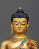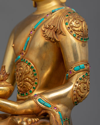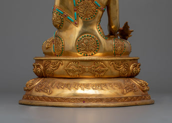 With the Bhaiṣajyaguru Statue, which is made with unmatched devotion and creativity, enter the realm of divine healing and spiritual refreshment. This magnificent statue invites you on a voyage of complete well-being and inner transformation with its healing radiance and divine elegance. Exhibiting painstaking artistry, it boasts elaborate 24K gold gilding, radiant acrylic and gold paintings, and hand-carved gemstones that perfectly encapsulate the restorative power of Bhaiṣajyaguru. The statue exudes the Medicine Buddha's healing energy because every detail reflects the talent and commitment of skilled craftspeople. Whether it is put in your home, business, or sacred location, behold its calm visage and loving presence, bringing tranquility and inner peace and acting as a potent reminder of the healing potential inside us all.