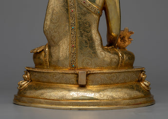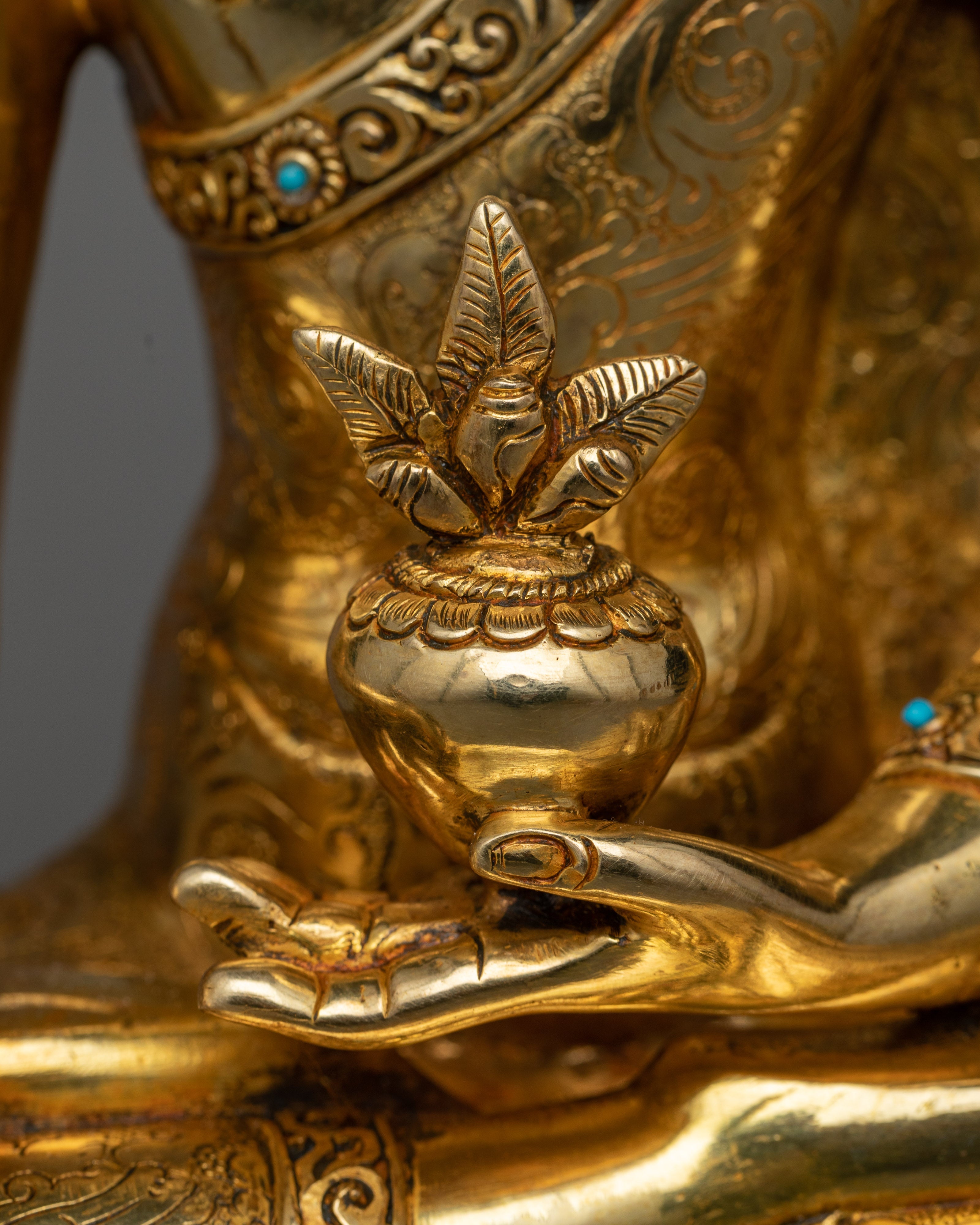 The sculpture depicts Bhaisajya Guru Buddha in his characteristic stance, holding the medicine bowl in his lap and filled with the nectar of immortality, representing the ultimate cure for all suffering—spiritual enlightenment. The intricate details, from the serene expression on his face to the elaborate folds of his robes, are accentuated by the rich gold gilding, embodying the luminosity and purity of his compassionate vow to aid all sentient beings in overcoming illness and obstacles.