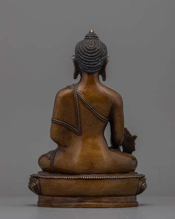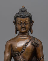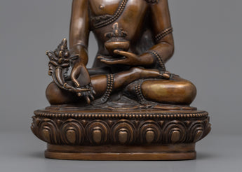 We are Nepali artists that hand-carved this magnificent Bhaisajyaguru Buddha Statue for Healing using techniques that had been passed down to us through the years. The statue's distinctive design patterns are masterfully etched into its oxidized copper body. The deity is depicted with a contented expression while seated on a moon-shaped lotus seat. He has a myrobalan plant just above the ground in his right hand and an alms bowl in his left hand. We hand-carved elaborate design patterns into the robe with a hammer and chisels.