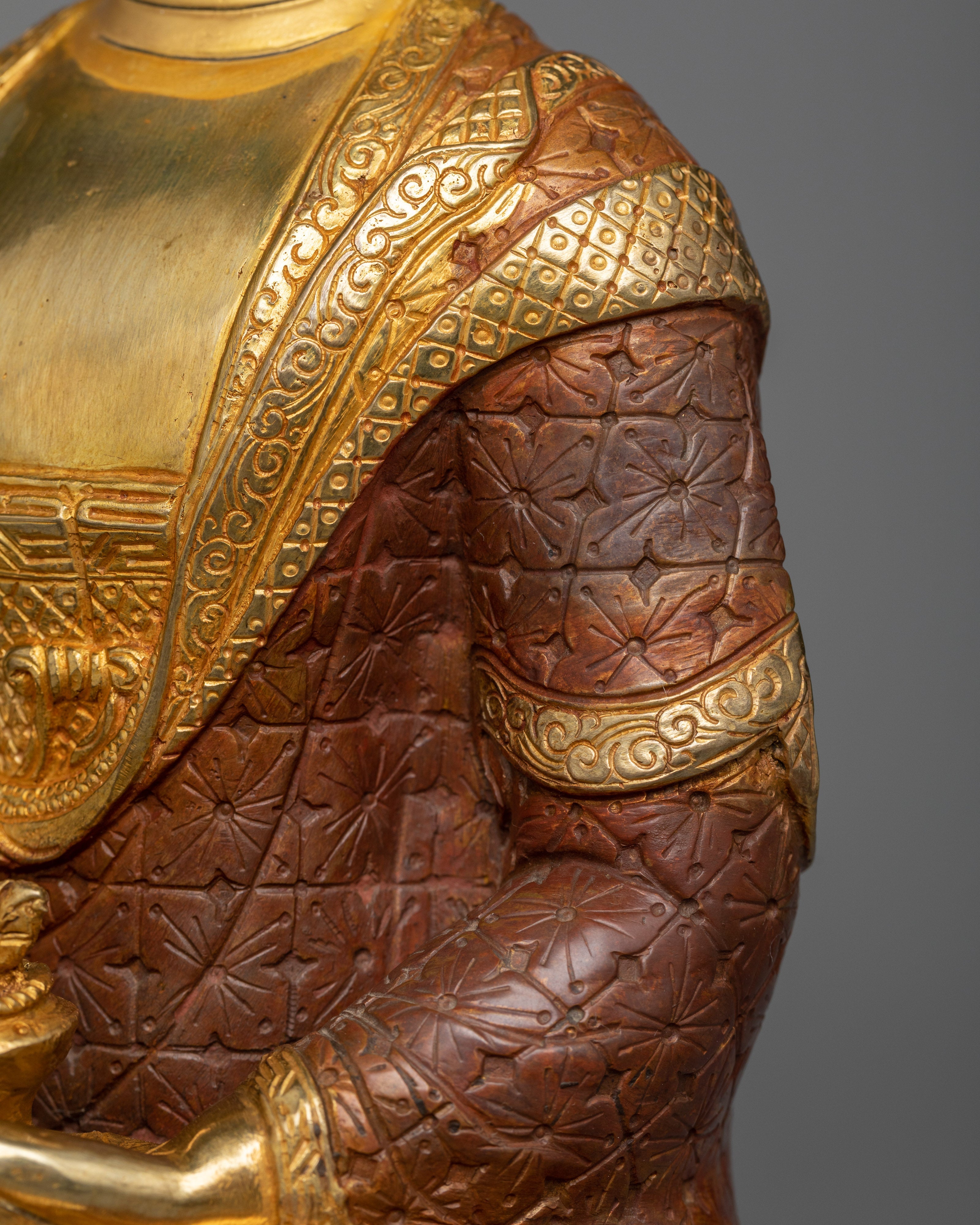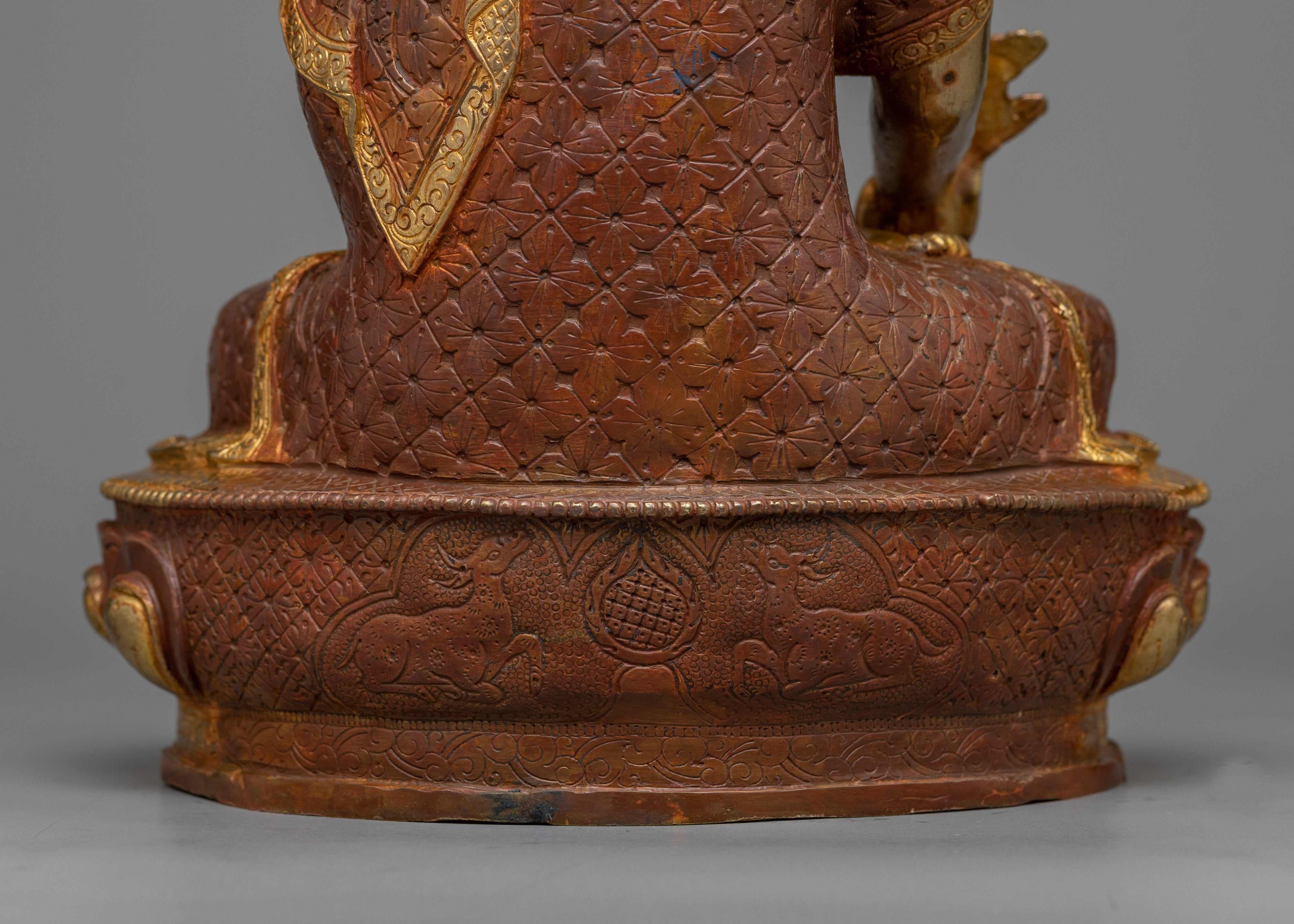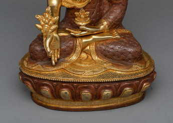 This sculpture is made of oxidized copper and gilded with 24K gold, exhibiting a strong feeling of devotion and holiness. The statue's exquisite gold finish not only adds to its visual attractiveness but also represents Bhaisajyaguru's celestial nature and healing abilities. The intricate gold and acrylic paintings enhance the statue by highlighting Bhaisajyaguru's peaceful demeanor and the symbolic instruments he holds.