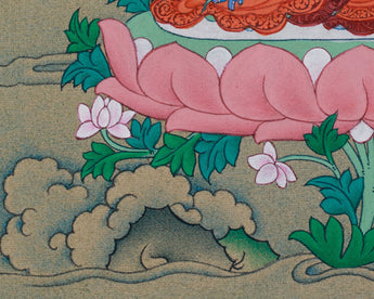 Bring calm and spiritual peace into your space with this vibrant Bhaisajyaguru Buddha Thangka, hand-painted in the traditional Karma Gadri style using natural stone colors and genuine 24K gold. Created from fine cotton canvas, the surface is initially prepared with natural chalk gesso to ensure a smooth, flawless foundation. The natural stone colors, sourced from minerals, precious stones, and botanical elements—give the thangka its rich, earthy tones and spiritual authenticity. Delicate layers of 24K gold highlight Bhaisajyaguru's aura, robe details, and celestial throne, making the artwork shine with divine brilliance and depth. The soft, spacious composition of the Karma Gadri tradition enhances the thangka’s meditative quality, letting the viewer connect deeply with the healing presence of the Medicine Buddha.