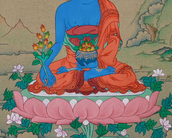 Bhaisajyaguru, also known as the Medicine Buddha, is the supreme healer in Mahayana and Vajrayana Buddhism. He's revered for curing physical, emotional, and spiritual suffering with the power of his enlightened mind and sacred vows. In this thangka, Bhaisajyaguru sits in meditative posture on a multi-petaled lotus throne, holding a bowl of healing nectar in his left hand and a myrobalan plant in his right hand—a symbol of longevity and healing. His deep lapis lazuli blue body radiates peaceful energy and reflects the vast, boundless nature of his compassion. Rendered with refined precision and symbolic depth, this Bhaisajyaguru Buddha Thangka serves as a powerful spiritual tool for meditation, visualization, and the invocation of healing energies. Whether used on an altar, in a shrine, or as a sacred art piece, it channels the profound intention of healing, clarity, and liberation from suffering.