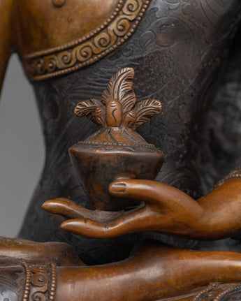 Bhaisajyaguru Healing Deity "Medicine Buddha" is a finely carved statue created by talented artisans in Patan, Nepal, a place known for its long legacy of Buddhist art. This statue is an important focus for meditation, supporting health, balance, and enlightenment in one's spiritual path. It is composed of an intricately carved oxidized copper body that represents the artists' dedication and skills. It measures 11.2"/28.5cm (Height) with a base width of 9.8"/25cm and weighs 3.12 kg.