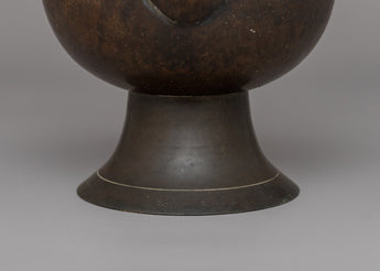 The Bhumba shown in the image is a traditional Tibetan ritual vessel that measures 27 cm in height and 15.5 cm in width and weighs 0.836 kg. This artifact is made of brass with an antique finish, giving it a timeless and historical look. The Bhumba is a sacred container used in Tibetan Buddhist ceremonies to hold offerings such as grains, water, and other ritual items.