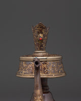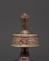 The Ritual Vase Bhumba is a container for blessings and spiritual transmission. Its design, with its highly sculpted copper body and brass embellishments, adds aesthetic and ritual significance, making it an essential instrument for spiritual practice. The Bhumba Set is essential for cleansing energy, providing spiritual nourishment, and commemorating significant milestones in Buddhist practice.