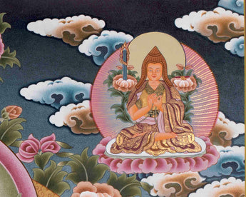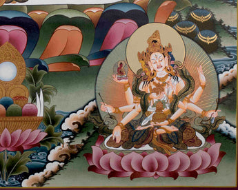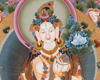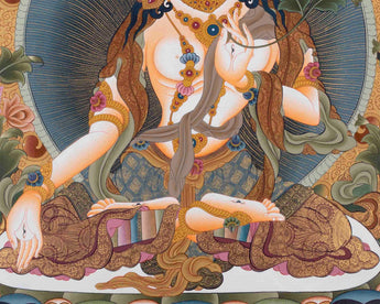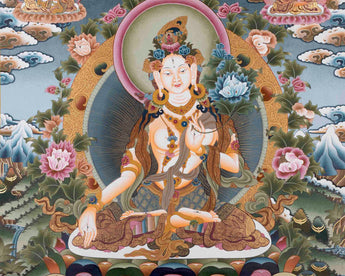 Presenting our "Big White Tara Thangka," a magnificent depiction of White Tara surrounded by Amitayus, Tsongkhapa, Shakyamuni, and Guru Rinpoche. White Tara, a revered bodhisattva in Tibetan Buddhism, embodies compassion, serenity, and enlightened wisdom. Adorned in white, she symbolizes purity and transcendent clarity, offering solace and guidance to practitioners.