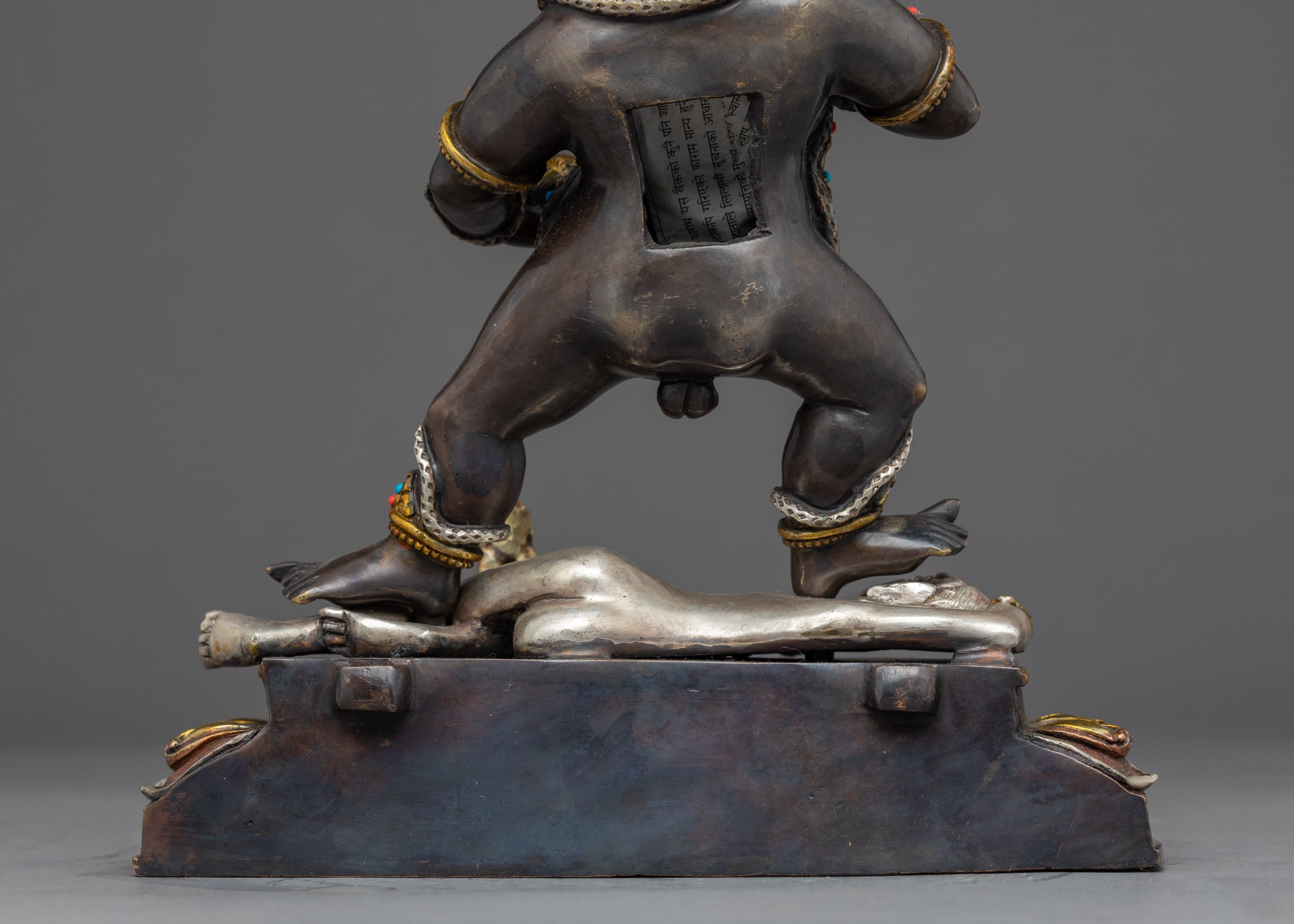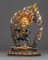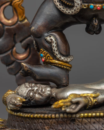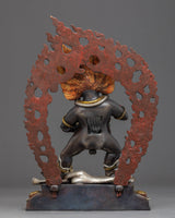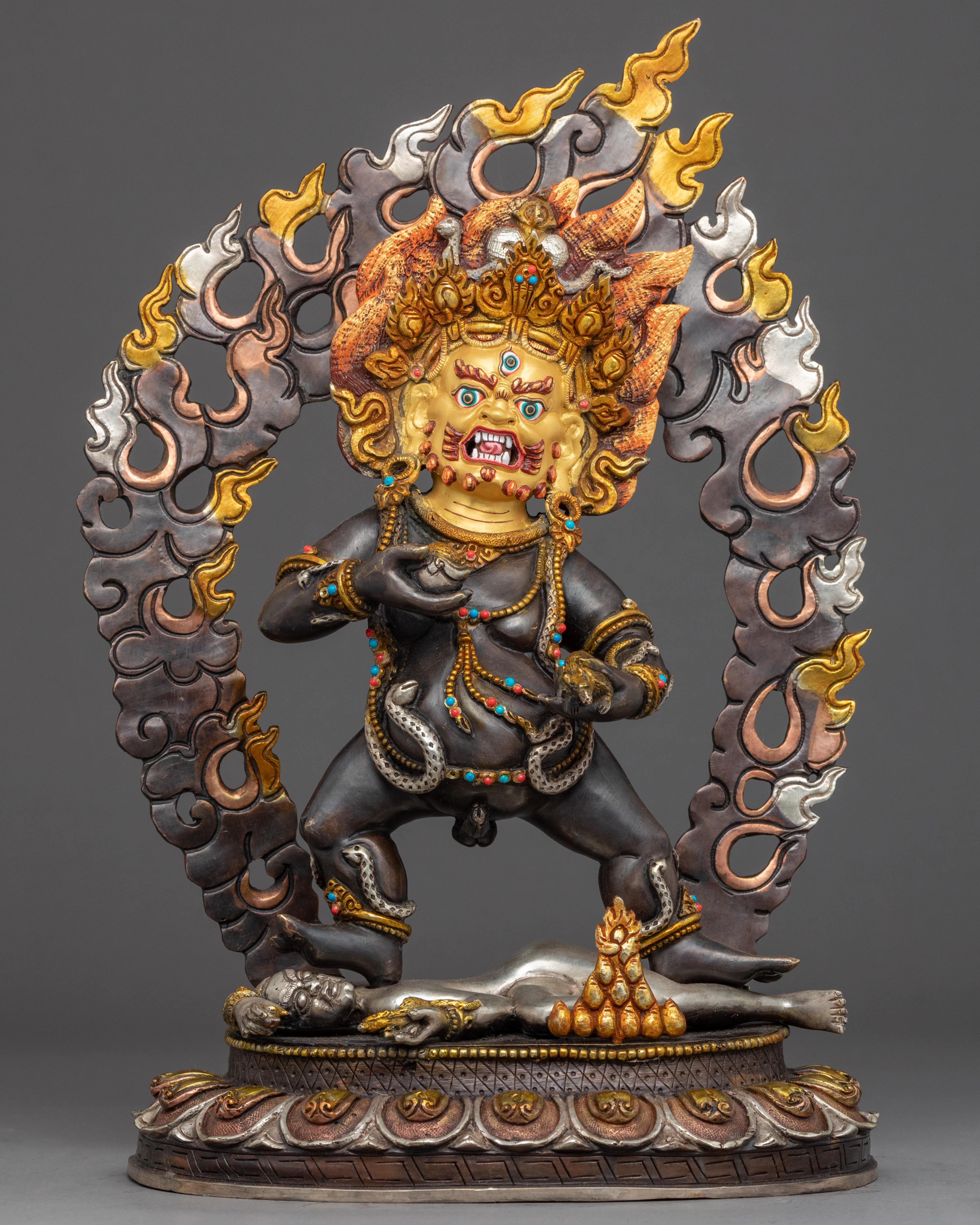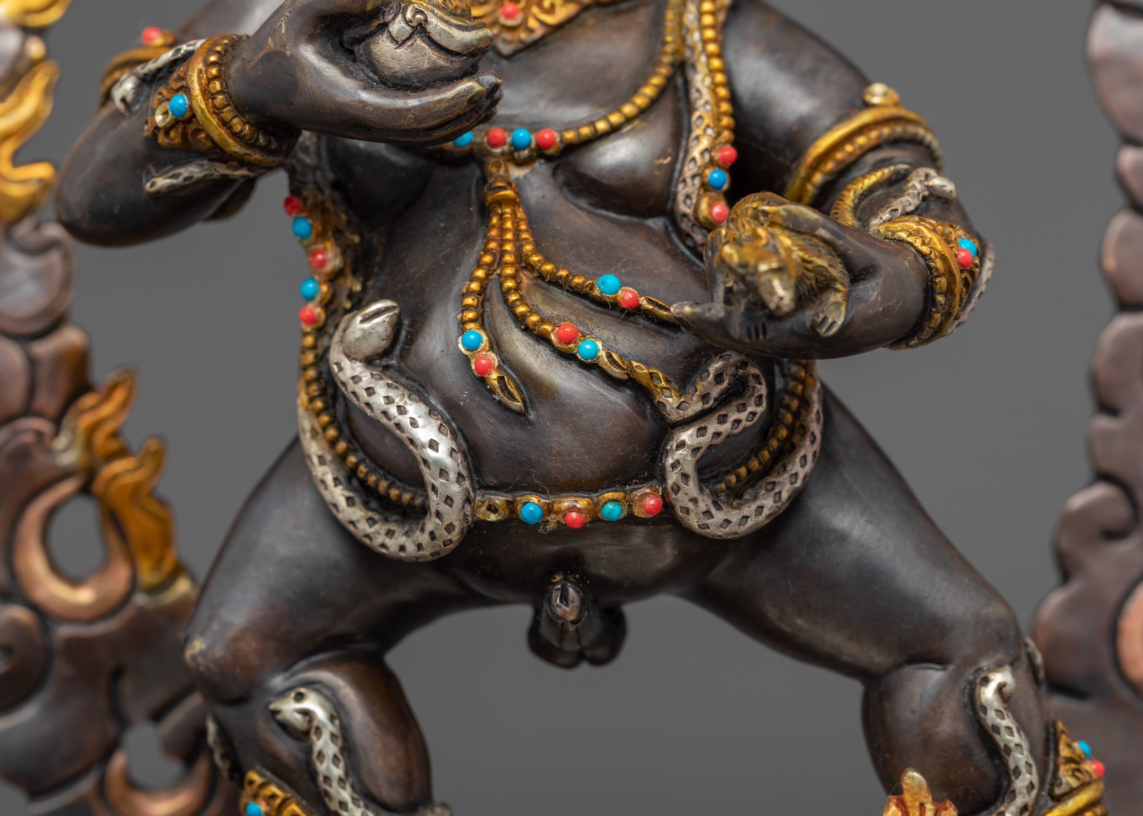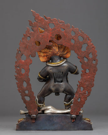 Traditionally crafted, the Black Dzambhala statue was handcrafted by our most skilled craftsmen from Nepal. Crafted from a copper body and then gilded with 24k genuine gold. The statue of the Dzambala's iconography denotes development and increase, from his skin's deep gold hue to his bulky build denoting riches, from the mongoose spewing wish-fulfilling diamonds to the fruit he is carrying. The right leg is extended, pressing upon the yellow Lord of Wealth beneath his foot. A fiery halo rages behind the deity. The elegant gold-plated and acrylic painted halo illuminates his face, while the wonderfully carved lotus seat is seen as mesmerizing.