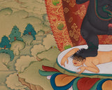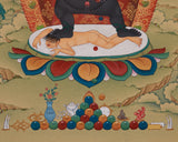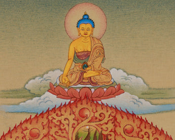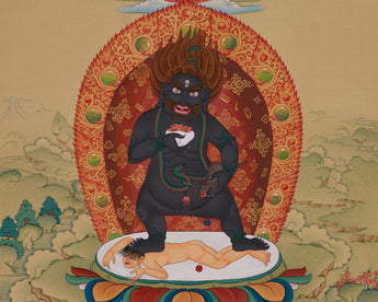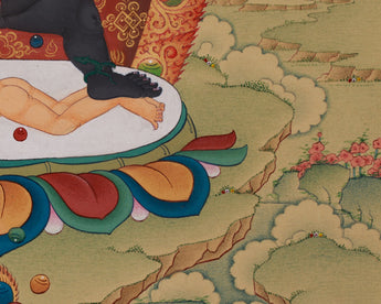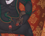 Witness the majestic Black Dzambhala, beautifully illustrated in this thangka alongside Ratnasambhava Buddha, crafted with great attention to the traditional Karma Gadri style. Recognized as the "Protector of Wealth," Black Dzambhala symbolizes spiritual and material abundance. Unlike other Dzambhala forms, his dark hue signifies his power to eliminate obstacles, dispel negativity, and equip practitioners to attain spiritual wealth. The rich stone colors add depth and brilliance to his image, enabling a strong connection with viewers, while the 24K gold highlights create a sacred aura, amplifying the deity’s brightness and underscoring his divine nature as a protector and bestower of wealth.