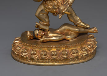 The Black Karma Dzambhala statue is 1.60 kg in weight and is 9.4" (24 cm) in height with a 6.9" (17.5 cm) base. This statue, which is made up of 24K gold-gilded copper and painted in gold and acrylic, represents the wealth deity Black Dzambhala's protective and vengeful demeanor. His fierce look represents his will to shield disciples from poverty and misfortune. In his hand, he holds a mongoose that spits jewels, indicating his capacity to provide wealth and fortune to believers. The skull crown he wears represents his victory over death and samsara and shows how bad energies may be transformed into positive outcomes.