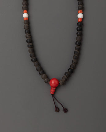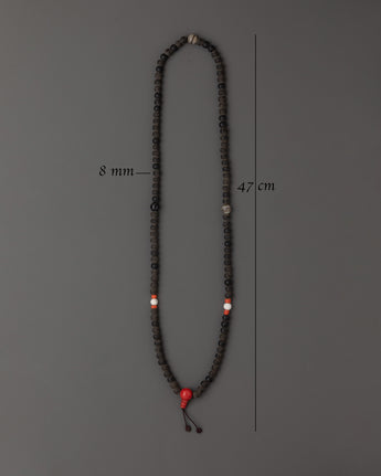 This Black Stone mala, measuring 47cm in total length and having 8mm-sized beads, is lightweight at only 0.086kg, making it ideal for everyday usage in meditation, mantra recitation, and as a spiritual necklace. Vibrant artificial coral and turquoise stones beads provide color and significance, while a bold red guru bead grounds the design in tradition.