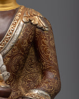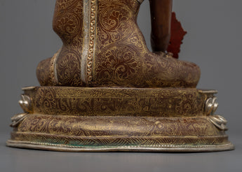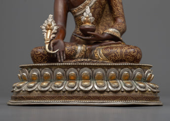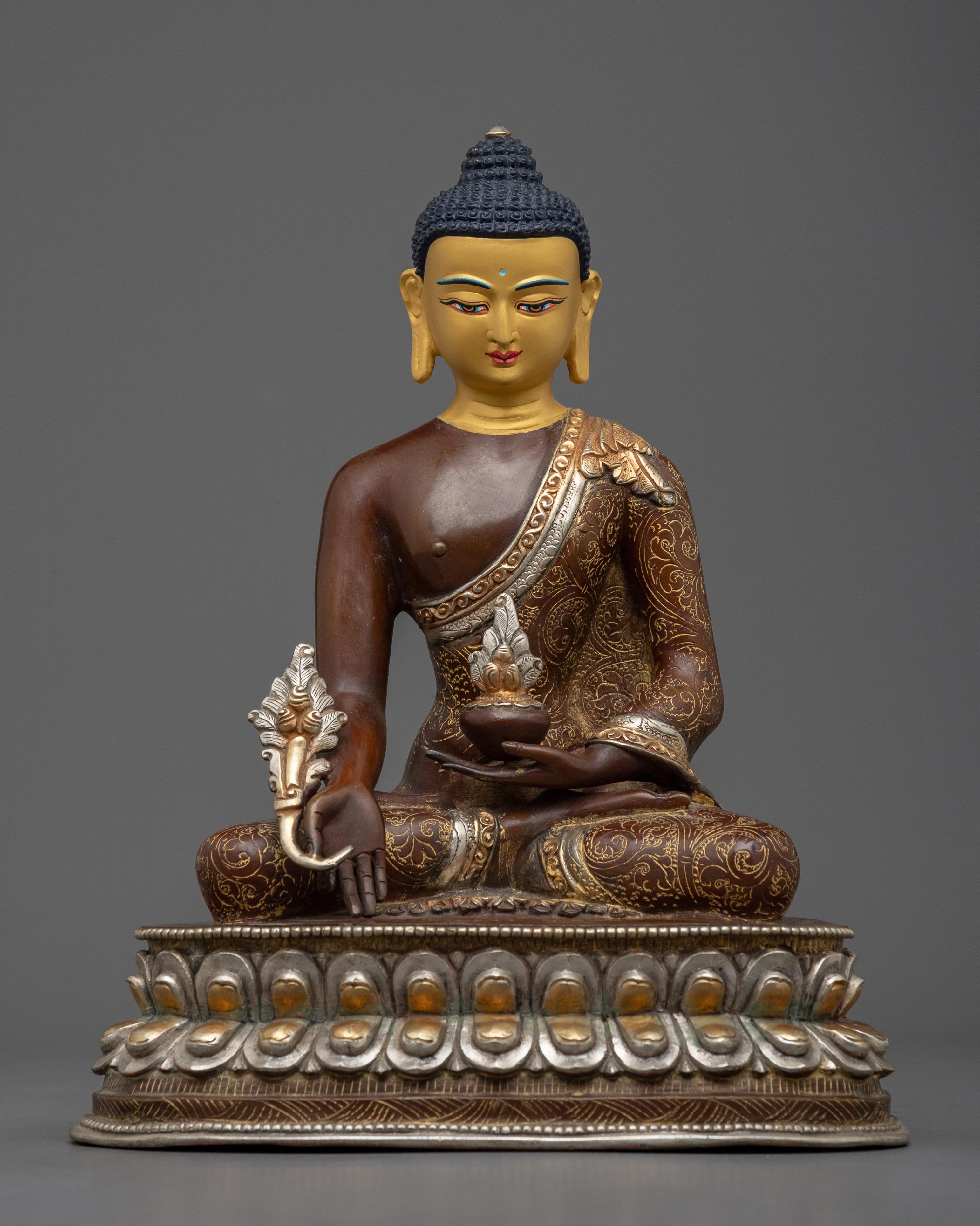 Our Blue Buddha Sculpture is a one-of-a-kind combination of spiritual meaning, aesthetic expression, and excellent craftsmanship. This statue, meticulously carved from an oxidized copper body and embellished with silver plating, 24k gold, and colorful acrylic paintings, is a monument to Nepalese craftsmen's profound skills.
